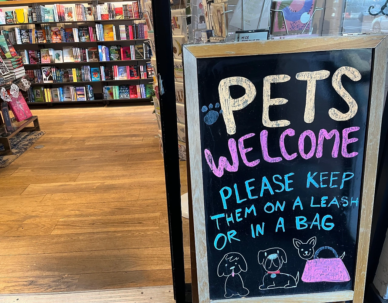 서점 입구에 있는 안내문이다. 리드줄을 채우거나 가방 안에 둔다면, 반려동물을 환영한다는 내용이다.