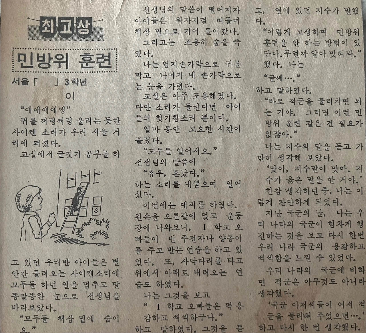 다음에 쓰려는 '오글오글 2'와 함께, 이 글 역시 손발이 몽땅 오글거리긴 마찬가지다. 글솜씨가 뛰어나서라기 보다 아마 그 시대가 원하는 글을 썼기에 상을 탈 수 있었다는 생각이 든다. 대결과 긴장으로 꽝꽝 얼어붙었던 냉전시대, 미술시간에 불조심 포스터와 함께 허구한 날 그리던 반공방첩 포스터, 공공장소에 흔하디 흔했던 각종 표어들만 생각해 보더라도 그 시절 나라 안팎 분위기가 꼬맹이였던 우리에게까지 얼마나 큰 영향을 미쳤을지 짐작할만하다. 휴전 중인 분단국가에서 태어난 우리의 운명에 대한 자각이 이미 그 무렵부터 스멀스멀 생겨나고 있었을 것이다.