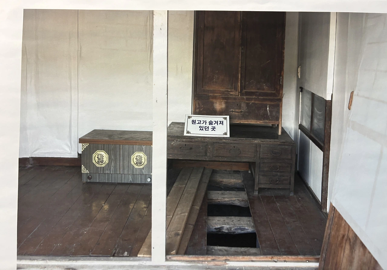 시인의 유고가 보존되었던 정병욱 가옥의 사진도 보았다. 전라남도 광양시 진월면 망덕리 249에 1925년 건립된 이 집은 국문학자 정병욱의 옛 집이다. 정병욱은 윤동주 시인의 연희전문(연세대학교) 후배였으며, 윤동주 시인은 1941년 발간하려던 <하늘과 바람과 별과 시>의 자필원고를 일제의 감시를 피해 정병욱에게 맡기고 유학을 떠난다. 그 후 강제징병을 당한 정병욱은 어머니에게 이 원고를 맡겼고, 그의 어머니가 항아리에 원고를 숨겨 보관했다고 한다.