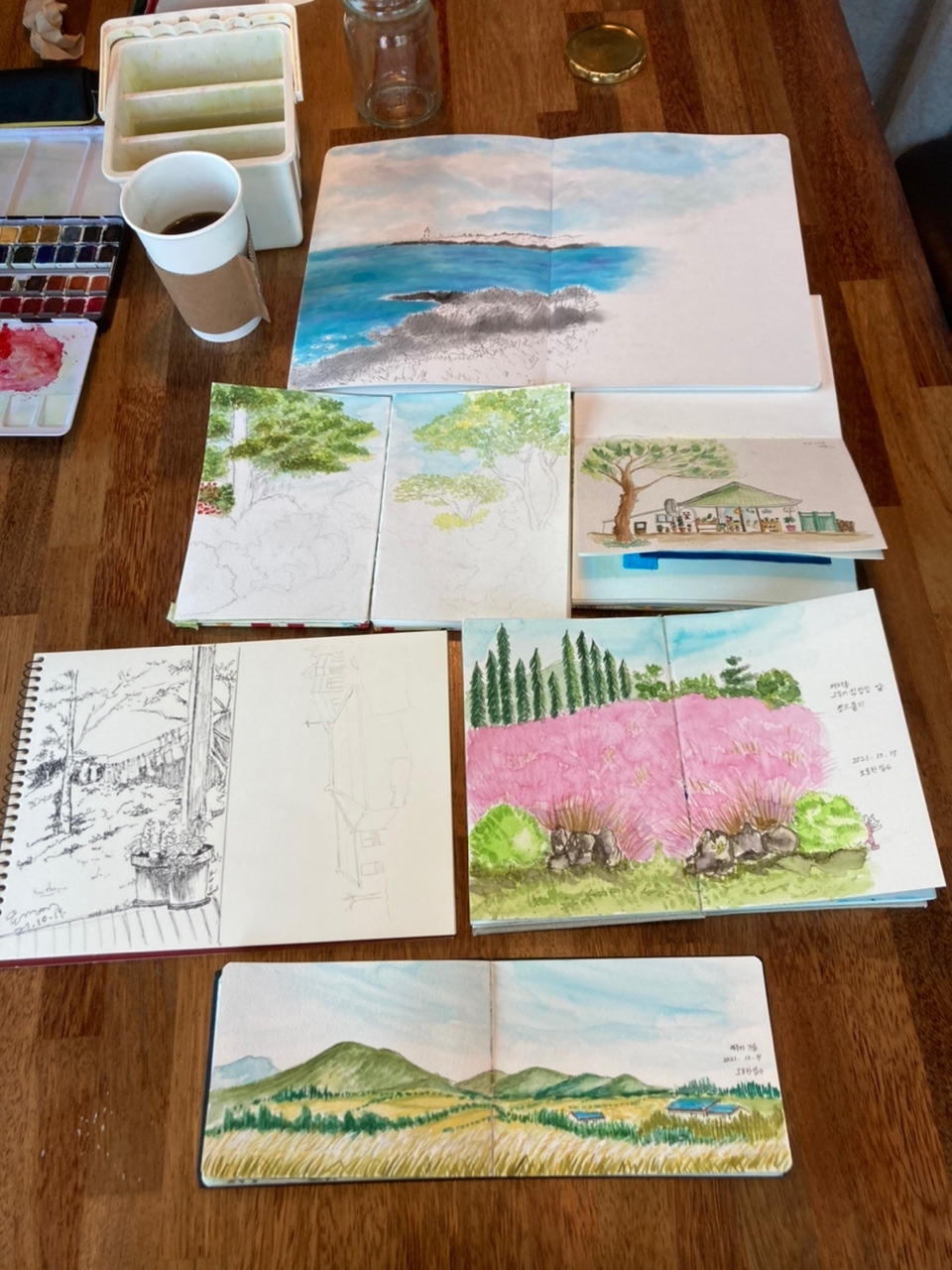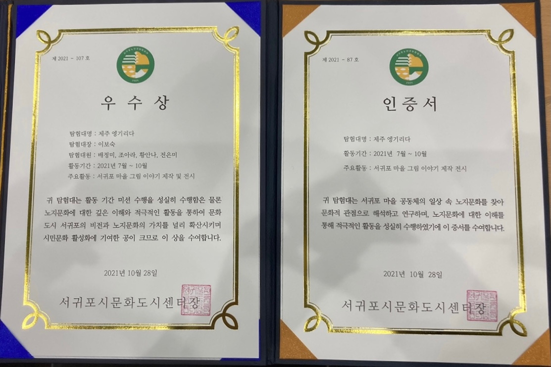 ‘제주 엥기리다’의 회원들은 그림 그리기를 직업으로 살아가는 이들은 아니었지만 3개월간 나름의 치열한 시간을 보냈다. 서귀포의 마을을 담은 소박한 그림들은 제주의 삶을 선택하고 제주를 사랑하는 이들이, 제주의 하늘과 바다, 검은 현무암, 낮은 돌담과 가옥, 팽나무와 해녀 삼촌들에 대한 감사와 존경을 표한 오마주였으며 앞으로도 계속 이어질 것이다.