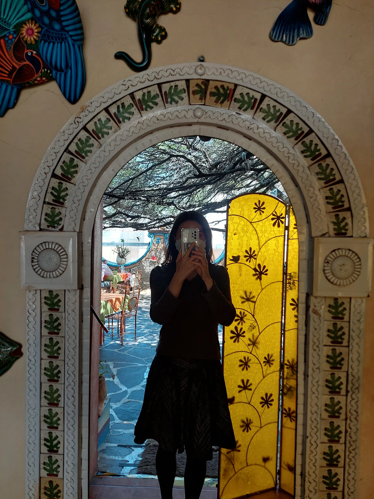 화장실도 정말 예뻤다. 어딜가나 스페인 타일이고 스테인드 글라스로 꾸며져 있다. 화장실에서 셀카 잘 안찍는데 이번엔 예외다. 에피타이저로 닭껍질 튀김이 나왔다