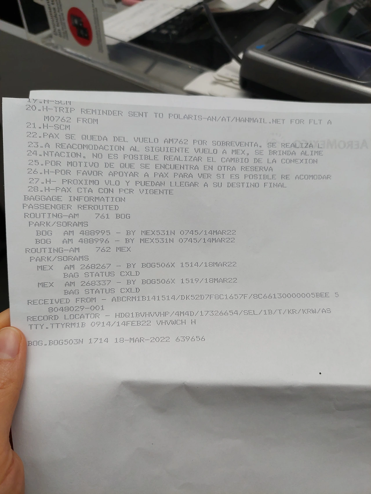 아에로멕시코 보고타 직원들은 9시간 이상 공항에 덩그러니 남겨진 나에게 물 하나 사 먹을 수 있는 돈을 주지 않았으며, 다음 편 비행기를 알아봐 준 것만으로도 그들이 할 수 있는 최선을 다한 것이라고 지껄였다. 그러니 내가 받아들이는 수밖에 없다고 했다.