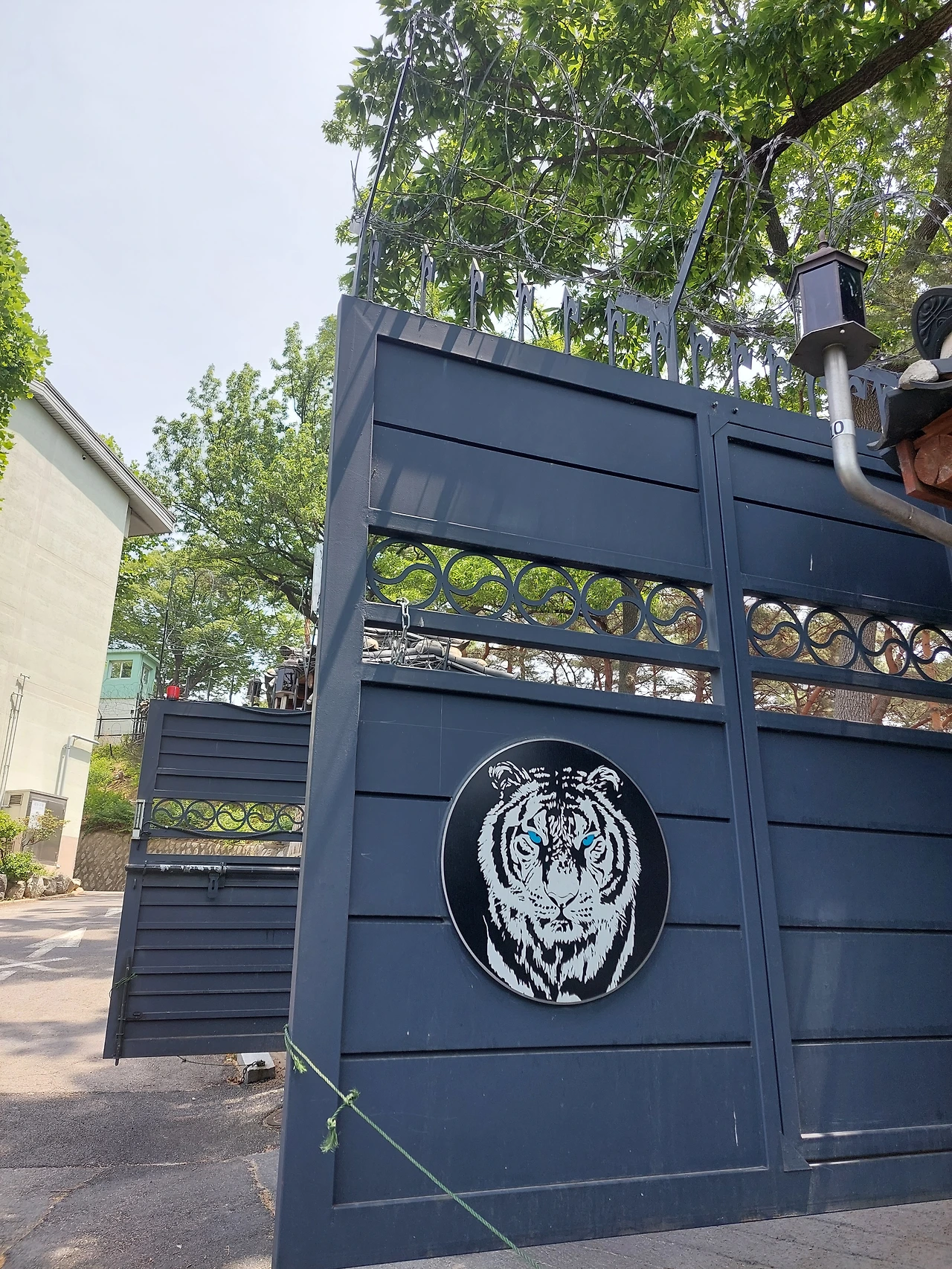 도둑이 담 못 뛰어넘게 하려고 이런 펜스를 설치한 걸까? 나무를 베지 않아서 정말 다행이다
