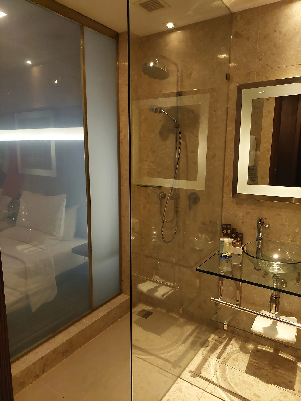 대마 이야기를 흥미롭게 듣다 보니 어느새 호텔에 도착했다. 이번에도 역시 나는 혼자인데 침대는 두 개다. 침실 옆에 샤워실이 있는데 벽을 투명과 불투명으로 내 맘대로 바꿀 수 있다