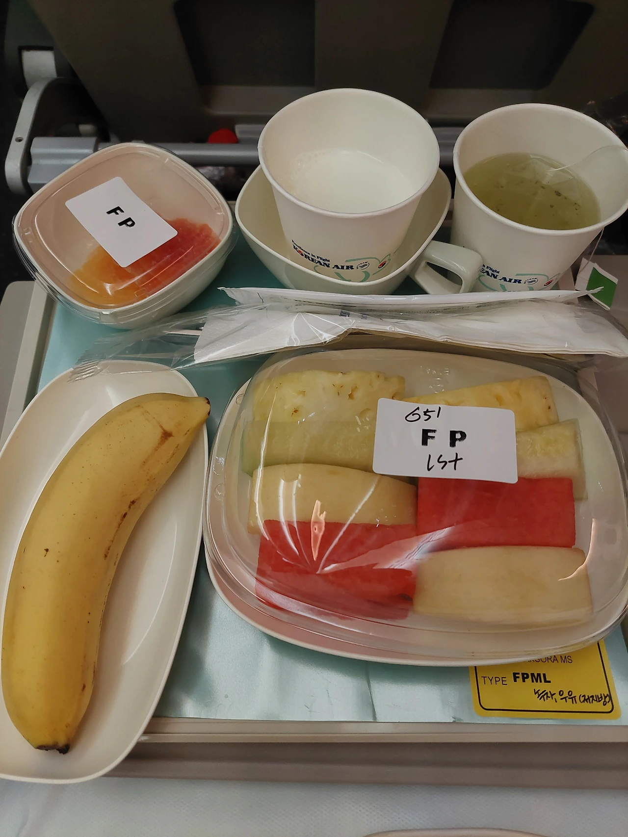 일반식을 먹으면 다들 노 마스크 상황에 노출되기 때문에 미리 특별 기내식을 예약해서 제일 먼저 밥을 먹고 마스크를 썼다. 음료는 따뜻한 녹차에 저지방 우유까지 마셨다