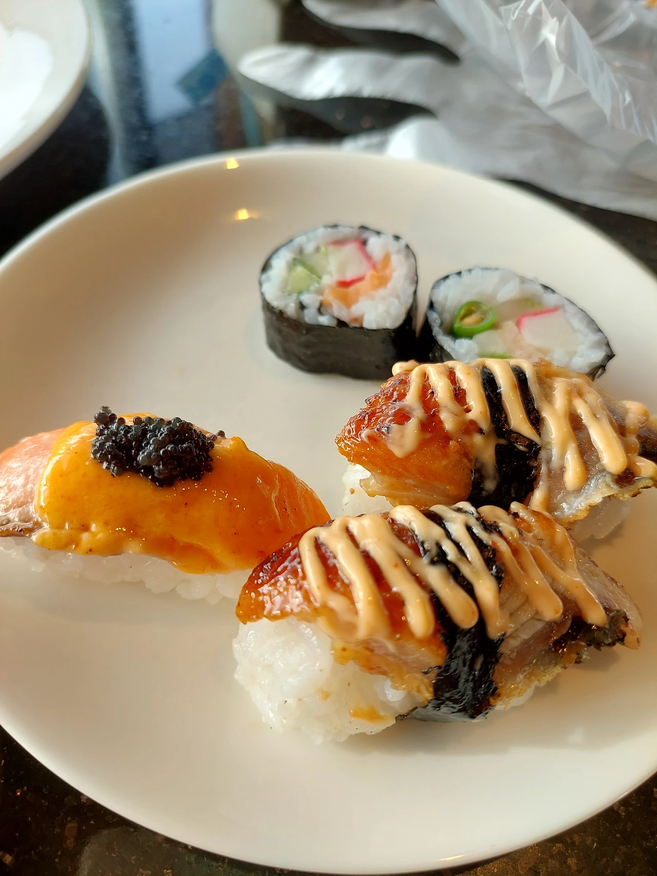 캐비어를 이렇게나 많이 올려주다니! 김밥처럼 생긴 것만 빼고 다 먹었다. 김밥으로 배를 채울 수는 없으니까!