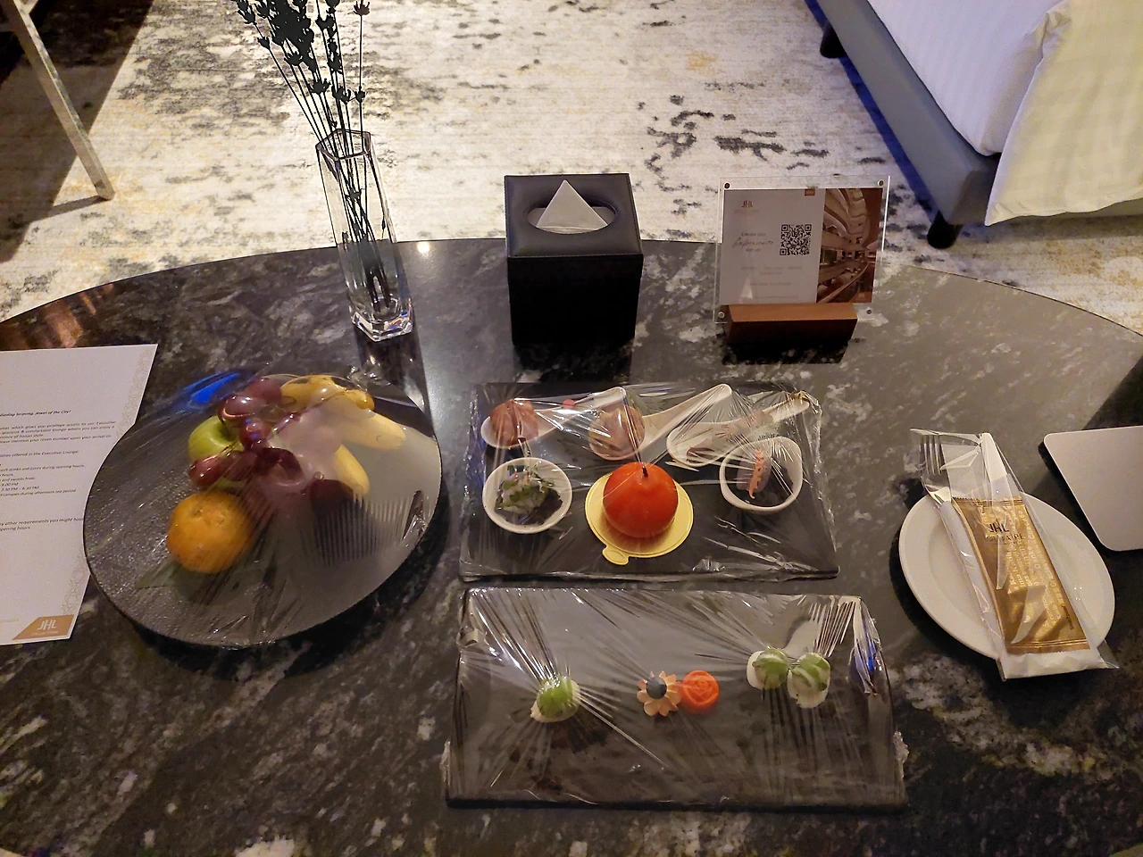 차와 커피를 마실 수 있는 공간 그리고 테이블에 웰컴 푸드가 놓여 있었다