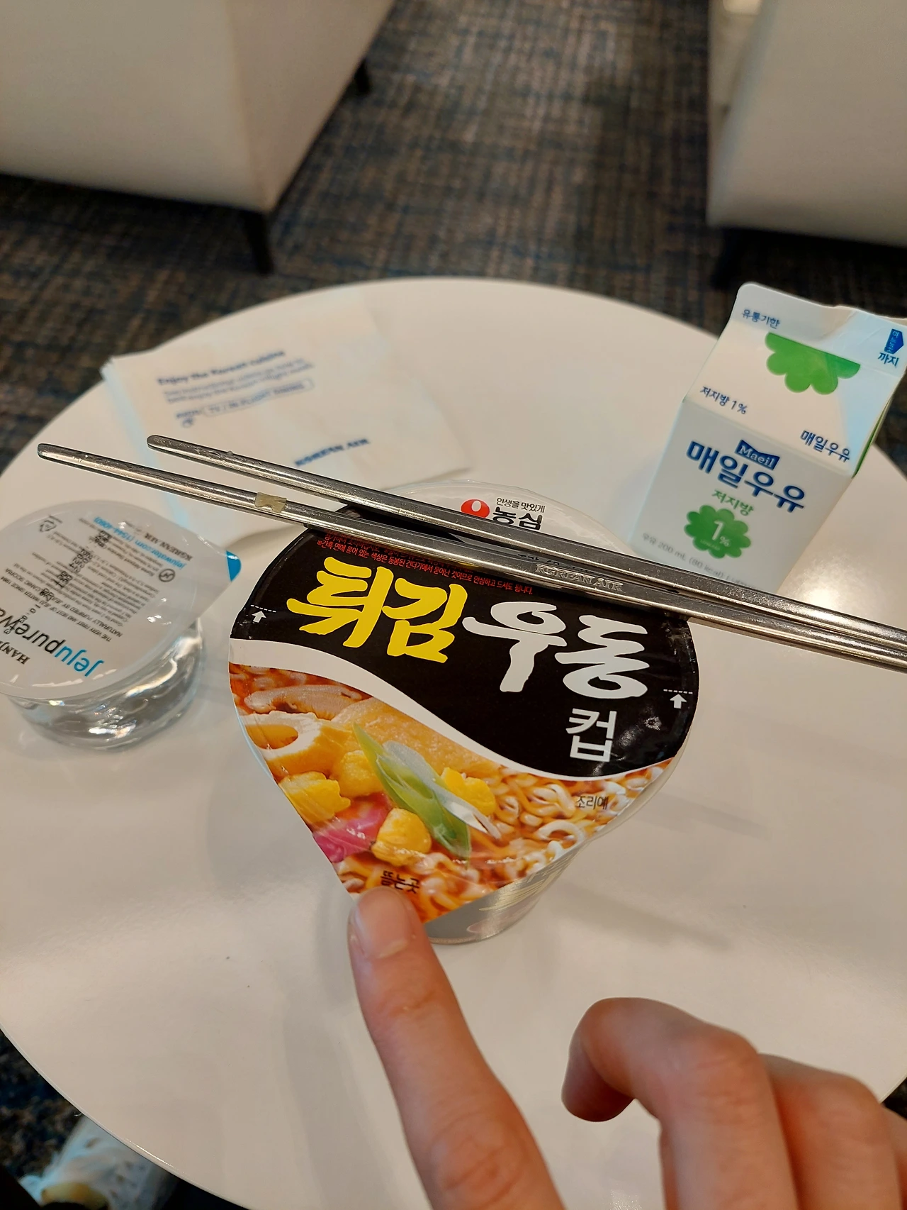 양심상 샐러드랑 저지방 우유도 먹고 마무리는 튀김 우동으로 입가심했다