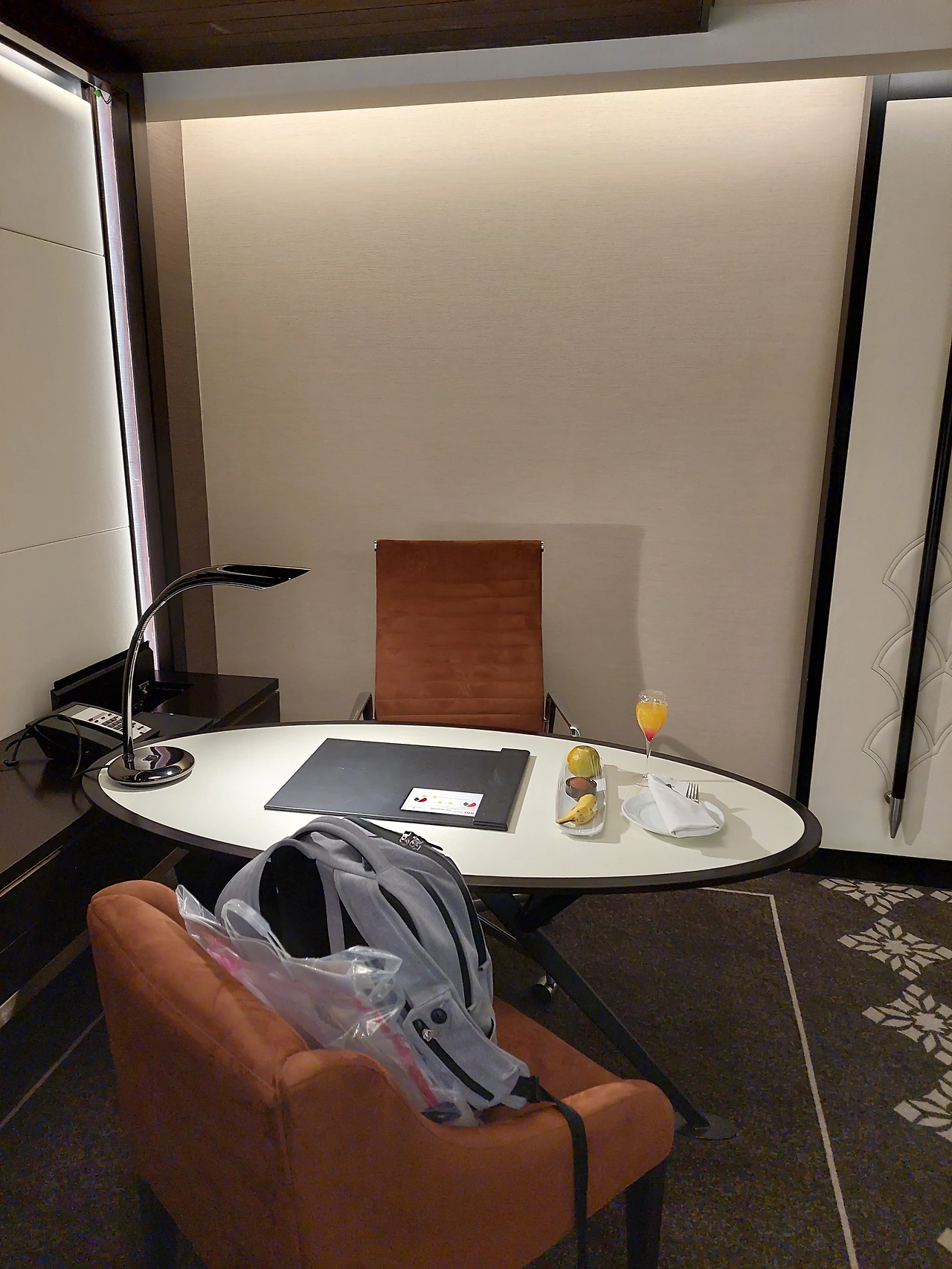 한 시간 정도 앉아서 일을 할 책상이다. 웰컴 푸드가 놓여있다