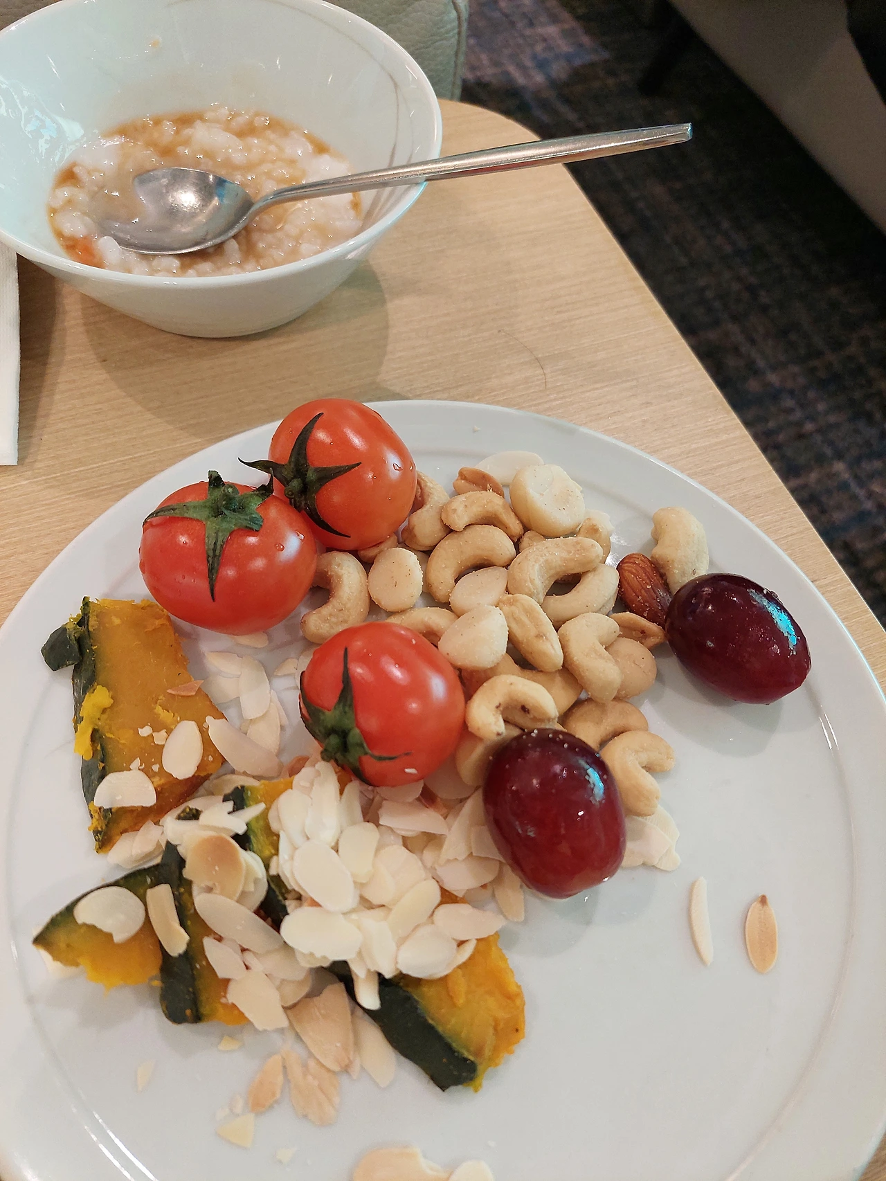 죽과 견과류, 과일, 단호박 그리고 아메리카노도 마셨다