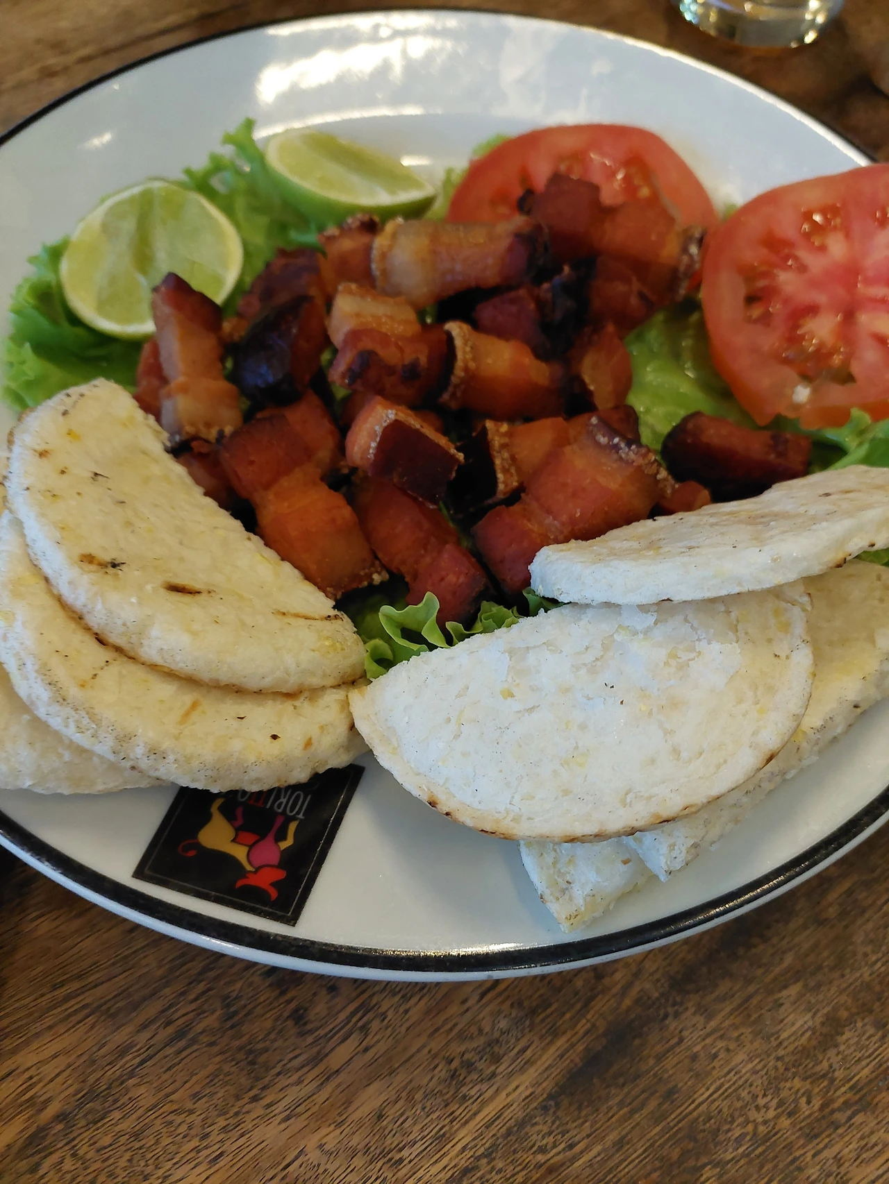 콜롬비아 에피타이자인 치차론과 돼지고기와 옥수수 빵이 또 나왔다. 위가 벌써 2/3가 찼다
