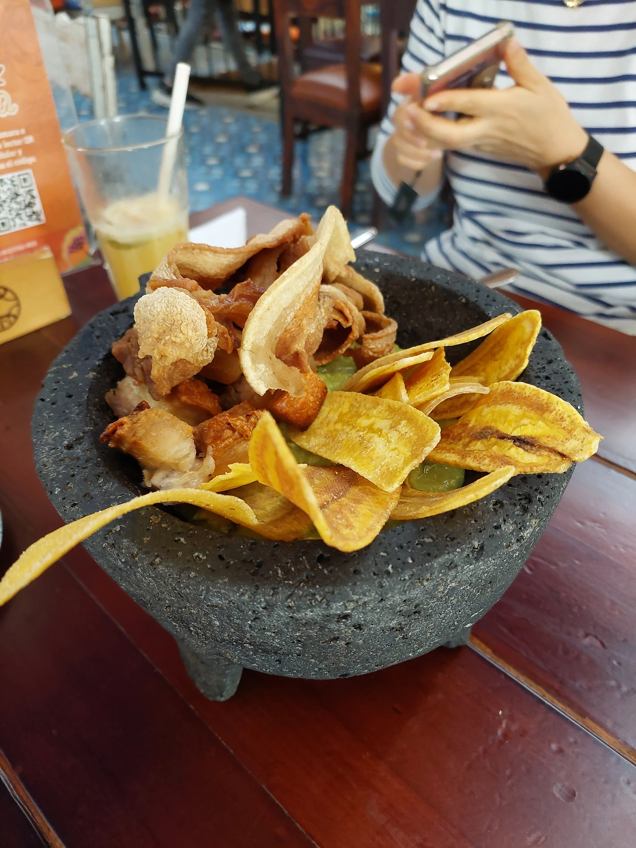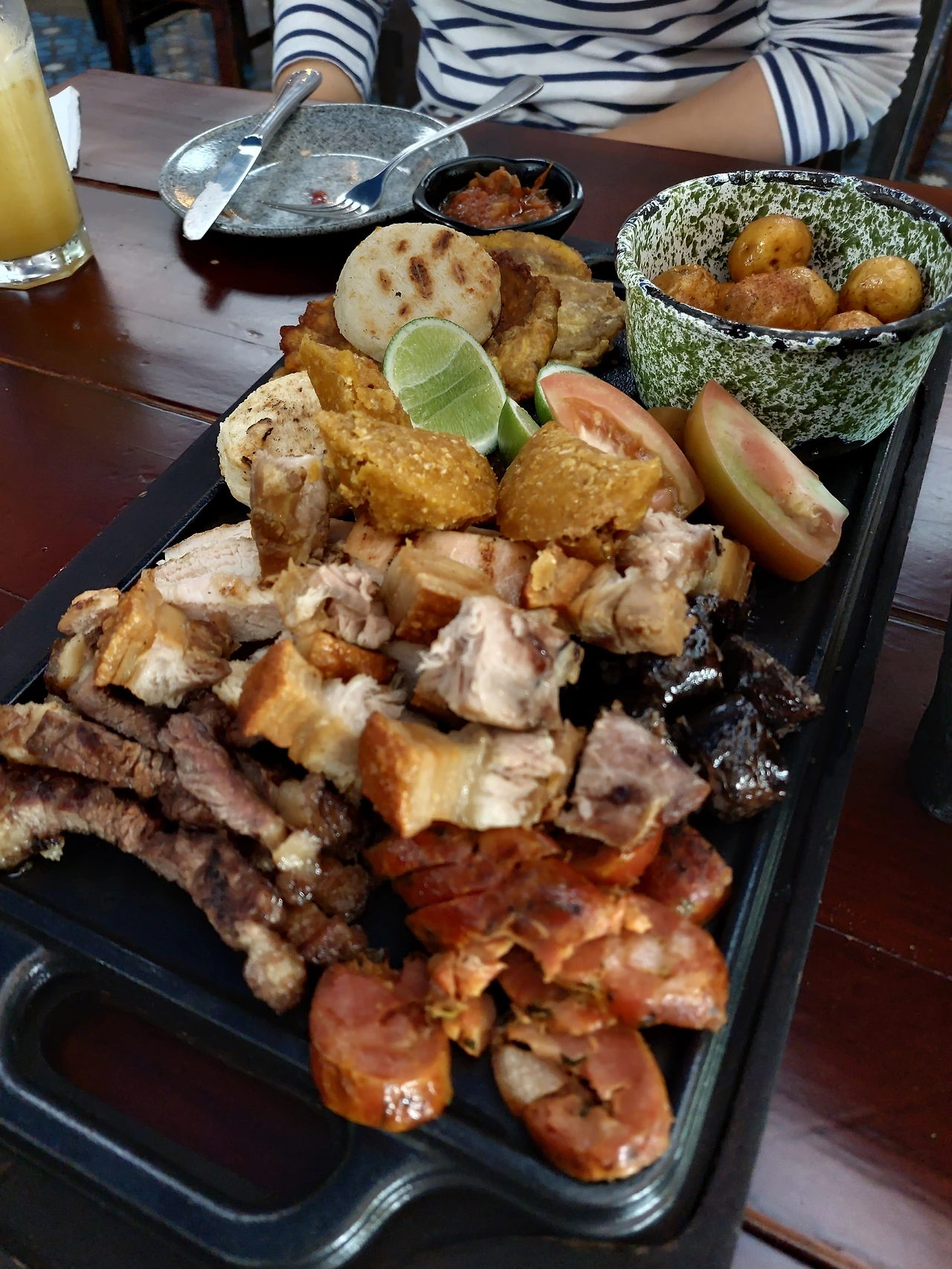 뜨끈한 돌솥에 돼지고기와 바나나 튀김 그리고 아래에 아보카도가 쌓여있었다. 중남미는 고기를 정말 많이 먹는다