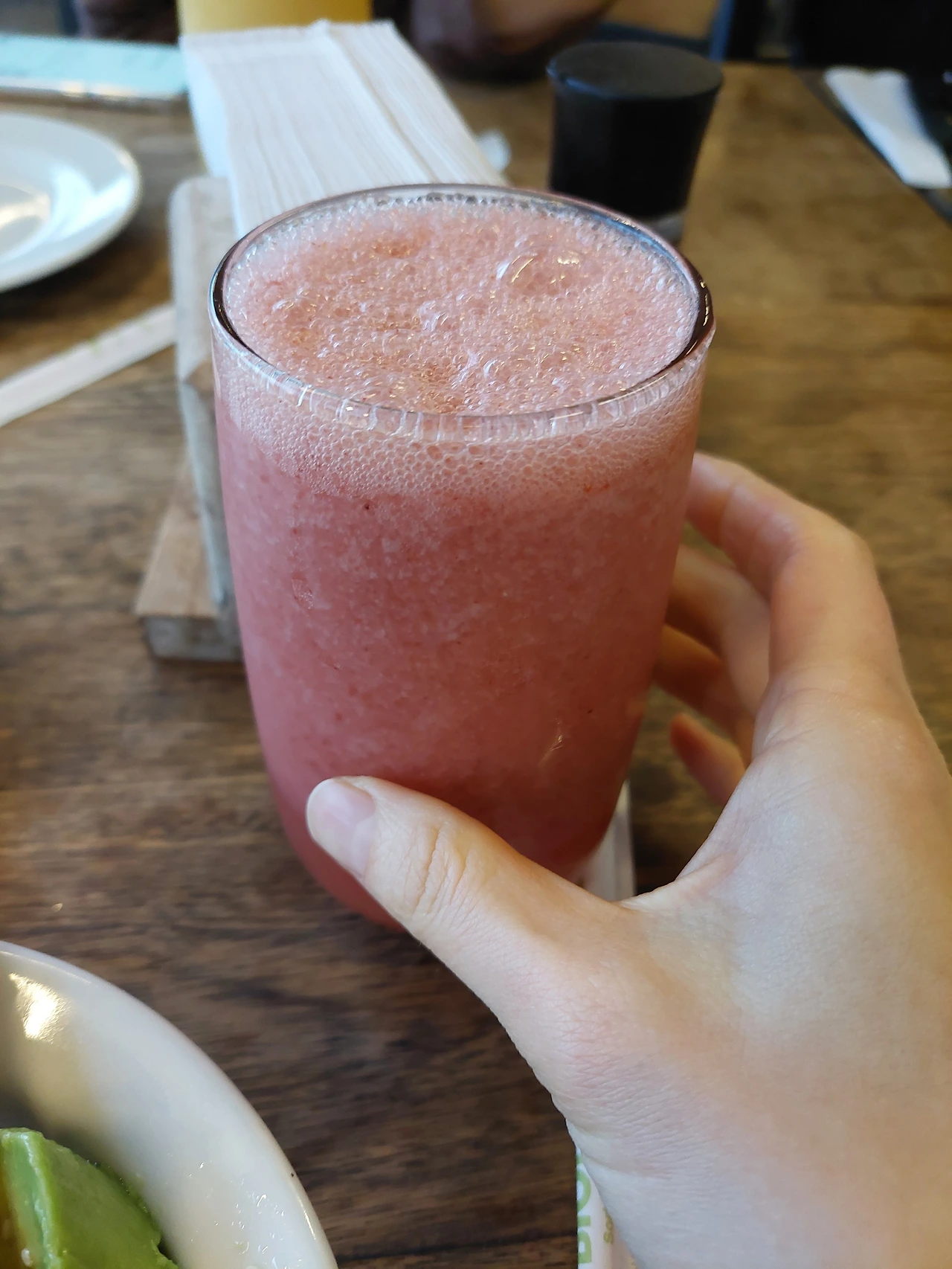 이번에도 또 딸기 주스다. 신선하니 맛있었지만 밍밍한 맛은 어쩔 수 없다. 우리 몸에 1도 도움이 안 되는 첨가제에서 빨리 벗어나야 한다