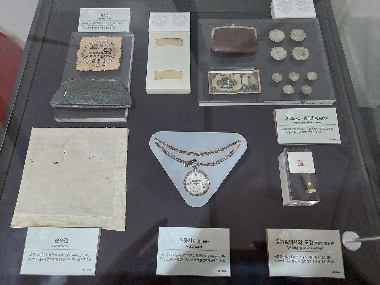윤봉길 의사가 순국할 때까지 사용하던 손수건과 도장 그리고 지갑과 중국화폐이다. 이 물건들을 일본 정부에서 보내왔다는 것도 신기했다