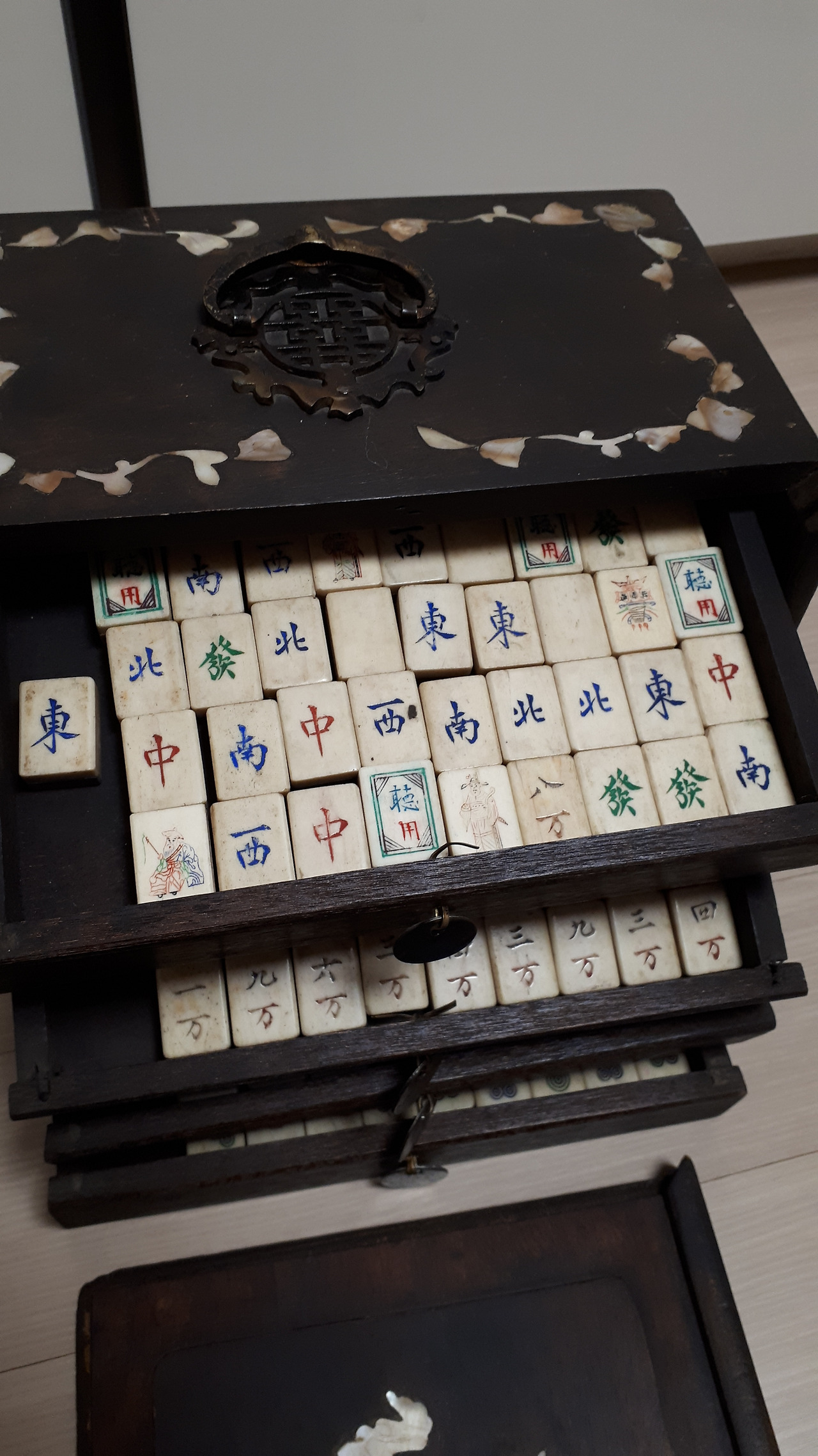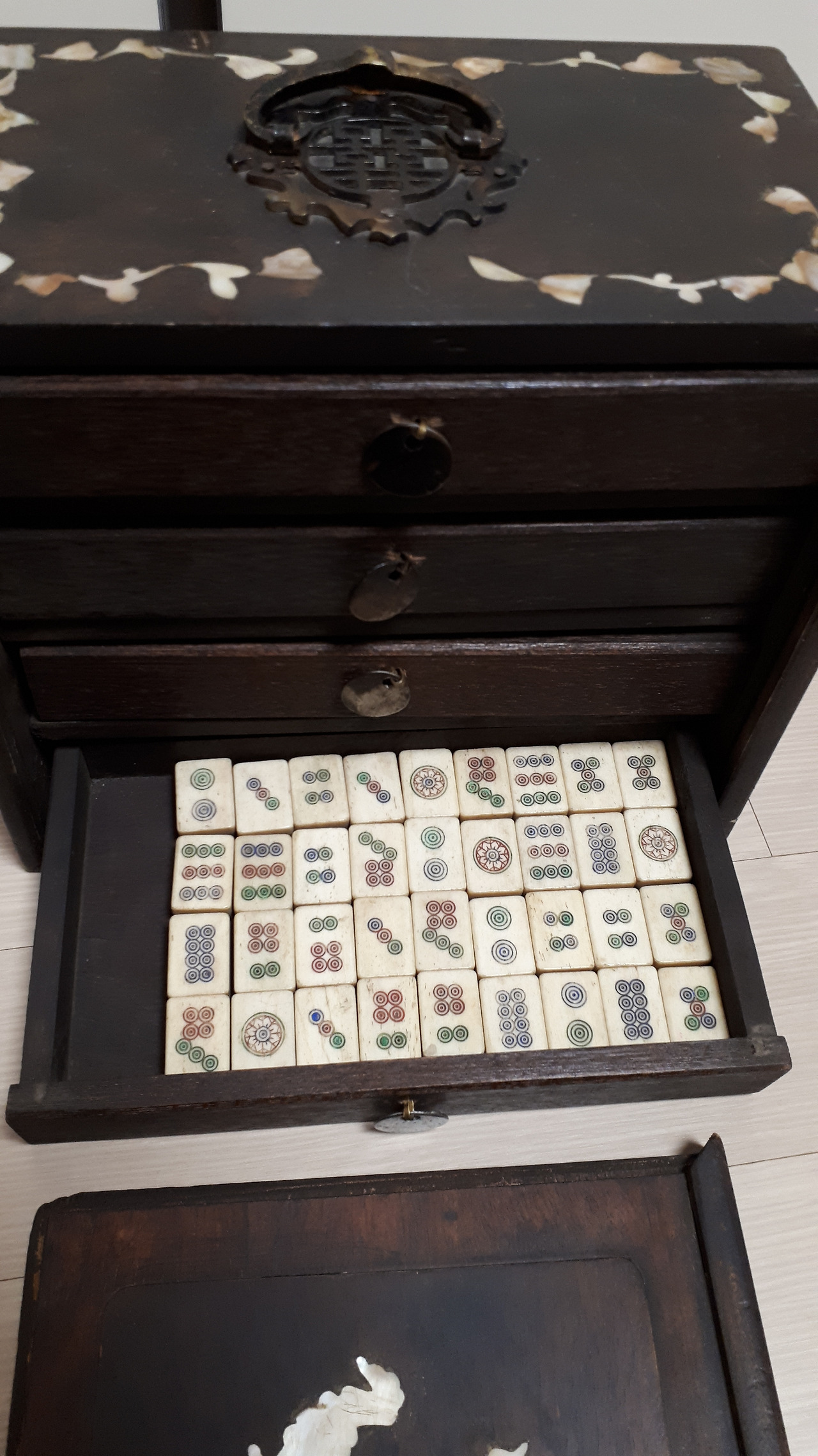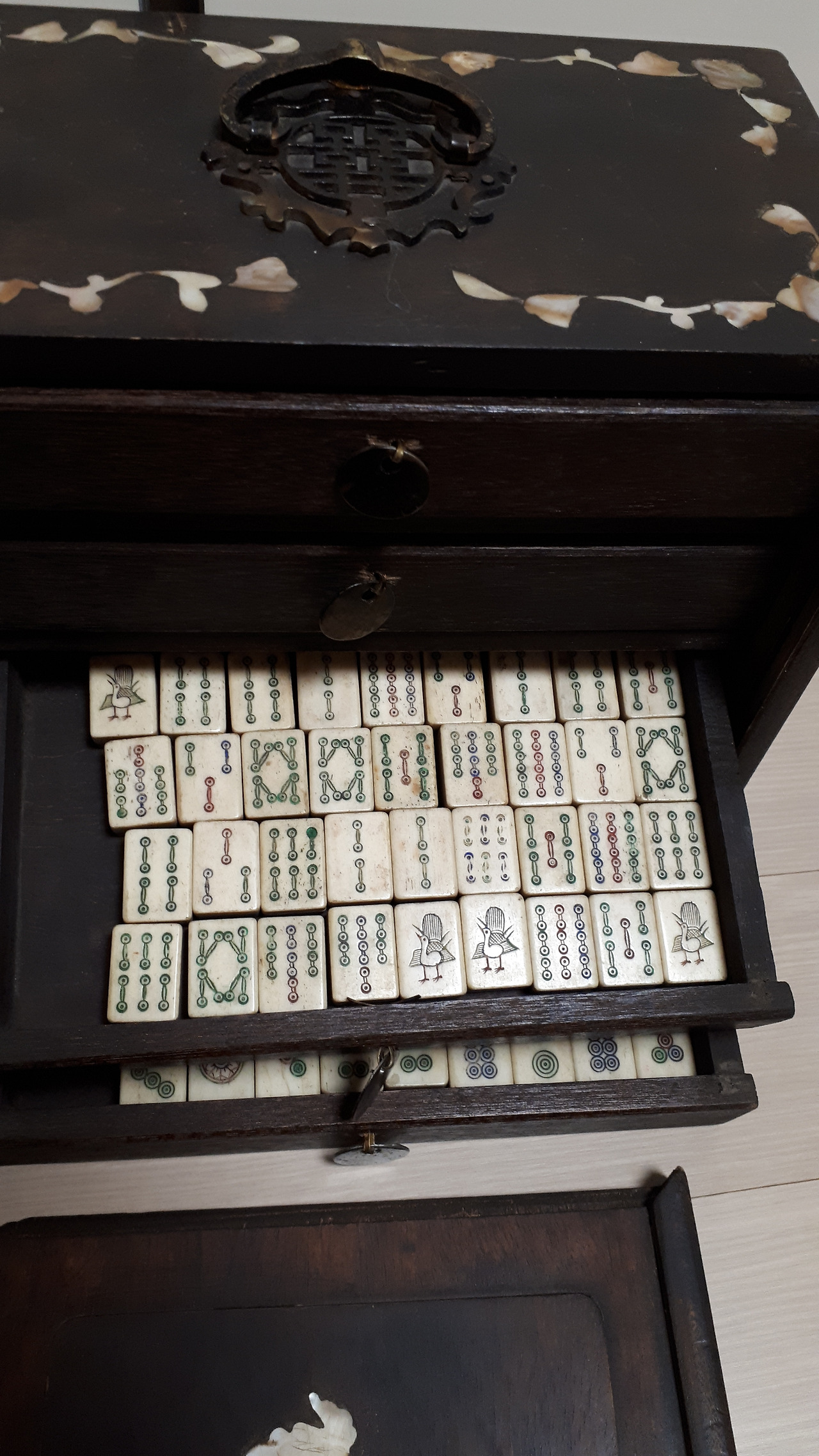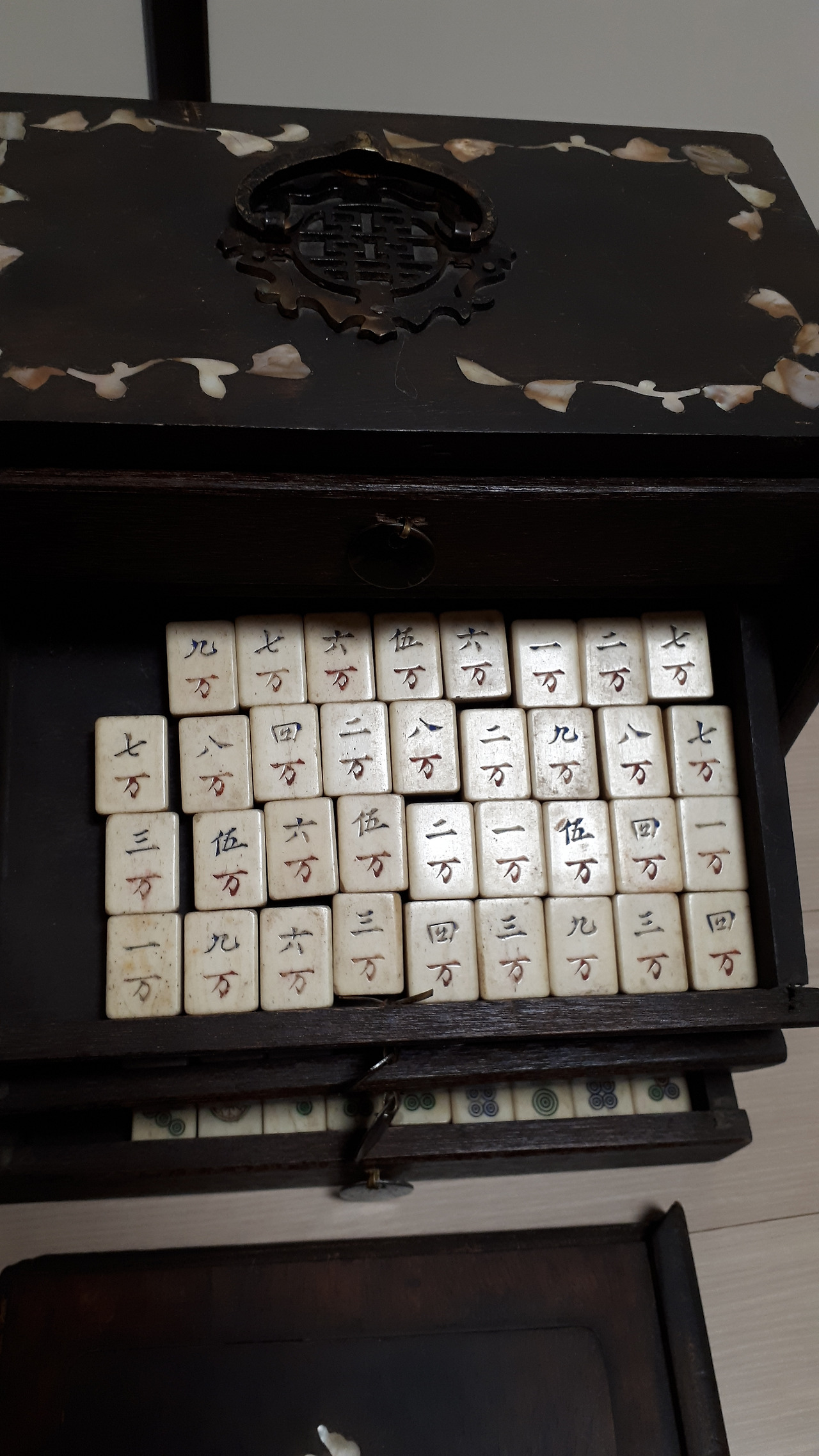 그러던 어느 날 종각에서 스페인어 수업을 마치고 북촌에 놀러 갔다가 빈티지 샵에서 자개장을 하나 발견했다. 4개의 서랍을 보며 여기다가 외화를 정리해서 넣어놔도 되겠다 싶었다. 엄청나게 먼지가 쌓여있던 이 자개장은 못질 하나 없고 이어 붙인 곳 없이 한 나무로 깎아 만든 것이었다. 이 장을 사려고 번쩍 들었는데 안에서 요란스럽게 달그닥 거리는 소리가 들렸다. 서랍 안에는 마작이 있었다.