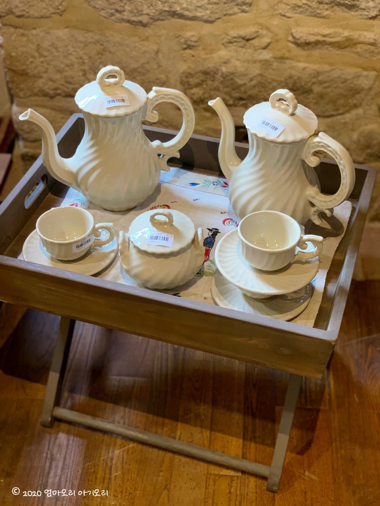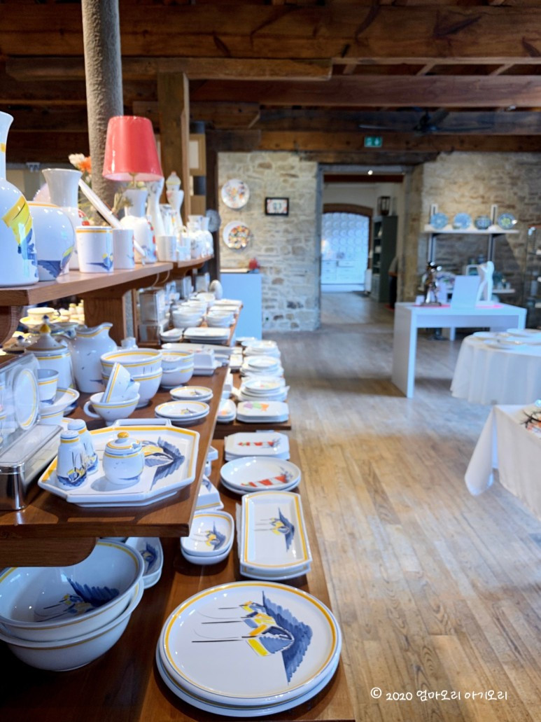 판매 공간은 전형적인 프랑스 집의 내부처럼 울퉁불퉁 돌 벽에 서까래와 같은 목조 구조가 결합된 공간이었다. 돌과 나무, 서로 다른 두 개의 질감이 만나서 예스러운 느낌을 내고 있었다. 성수기임에도 방문객은 그다지 많지 않았는데, 아마도 대부분은 길 건너에 있는 도자기 박물관에 가는 모양이다. 나는 어차피 프랑스어도 못 읽고 그릇도 살 생각이었기 때문에 숍으로 갔다.