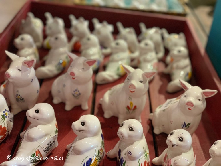캥페르에서 태어나고 자란 시아버님은 그릇들의 가격을 보더니 혀를 끌끌 차셨다. 실제로 살고 있는 주민이 지역 특산품의 거품 가격을 볼 때 나오는 흔한 반응일 테다. 시아버님은 미간에 주름을 힘껏 잡으며, 이 가격에 아무것도 사지 말라고 신신당부를 하셨다. 시아버님의 의견을 존중하여 우리는 돼지 한 마리만 샀다. 주먹 크기의 돼지 한 마리가 45유로.