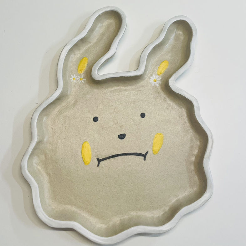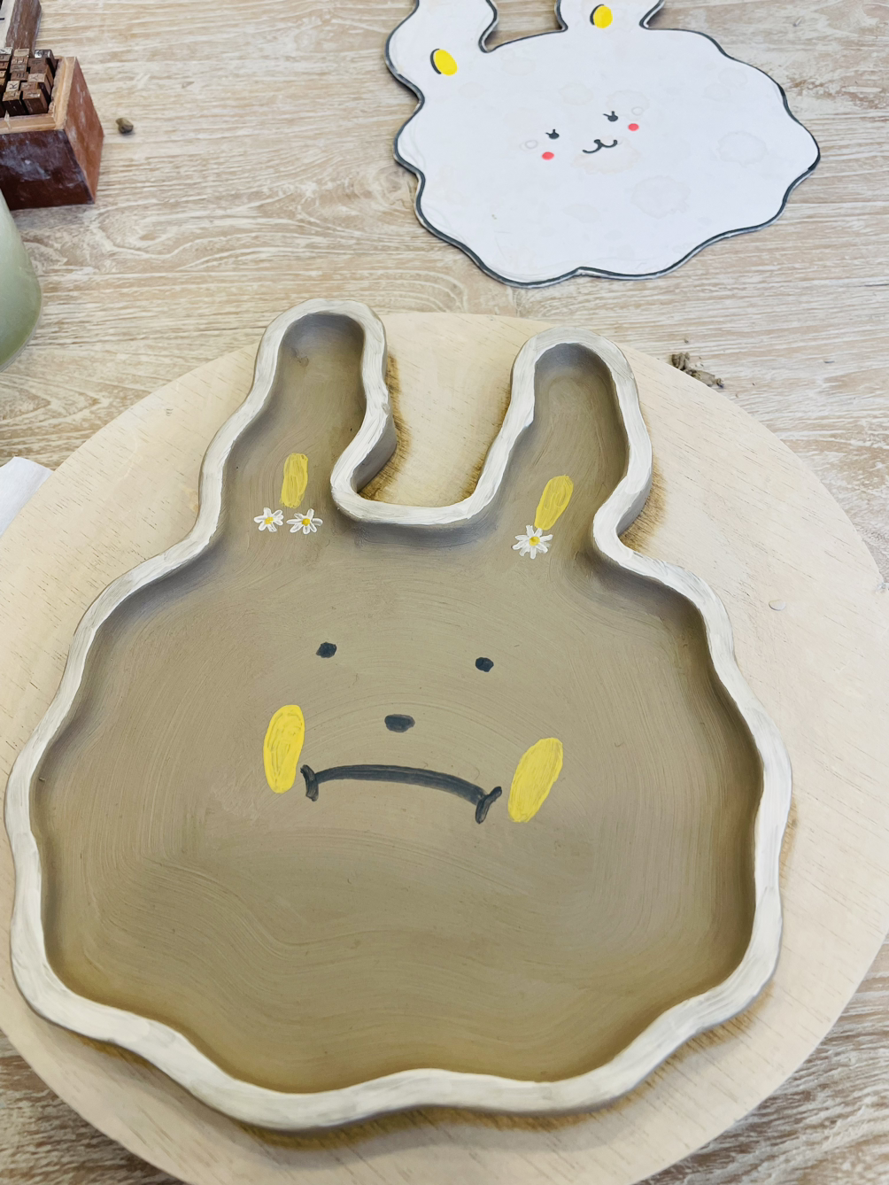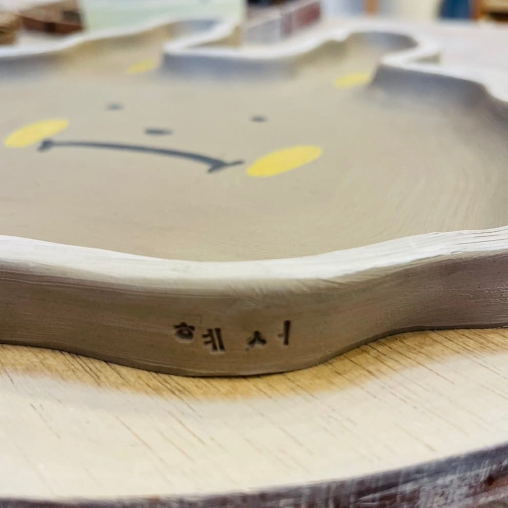 그런데 어딘가 이상했다. 내가 만든 토끼는 원래의 도안과 다르게 귀가 가지런했는데 도착한 완성품은 귀가 한쪽으로 기울어져 있었다. 남편의 조르디는 예뻐도 너무 예뻤다. 묘하게 다른 디테일에 3달 전에 찍어두었던 사진을 찾아보았다. 우리 부부가 만든 도자기는 깨진 건지 새로 만들어서 보내준 게 틀림없었다. 도안에 없는 꽃모양과 도장위치까지 다 비슷했지만 이름을 찍은 도장 글씨체가 달랐다. 내가 만들지 않은 핸드메이드 접시가 와버린 것이다.