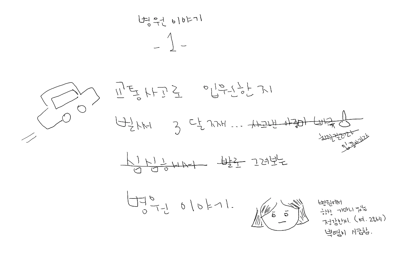소식을 들은 친구들이 병문안을 왔다. 사고가 난 지 한 달 정도가 지난 후부터는 마약성 진통제도 줄이고 잠도 밤에만 잘 수 있게 되면서 어느 정도 정신이 돌아왔다. 친구들은 나를 위로하며 긍정적인 말을 해주었다. "이 정도로 끝나 다행이지." "이참에 푹 쉬는 것도 괜찮을 수 있어." 좋은 말이었고 나도 맞장구쳤다. 이성적으로는 동의가 되니까. 단, 머리로는 받아들여지는데 마음으로는 진심으로 받아들여지지 않았다.