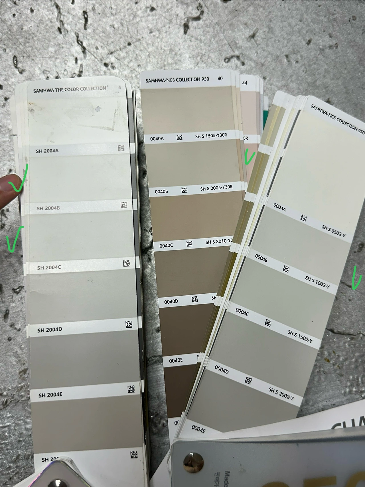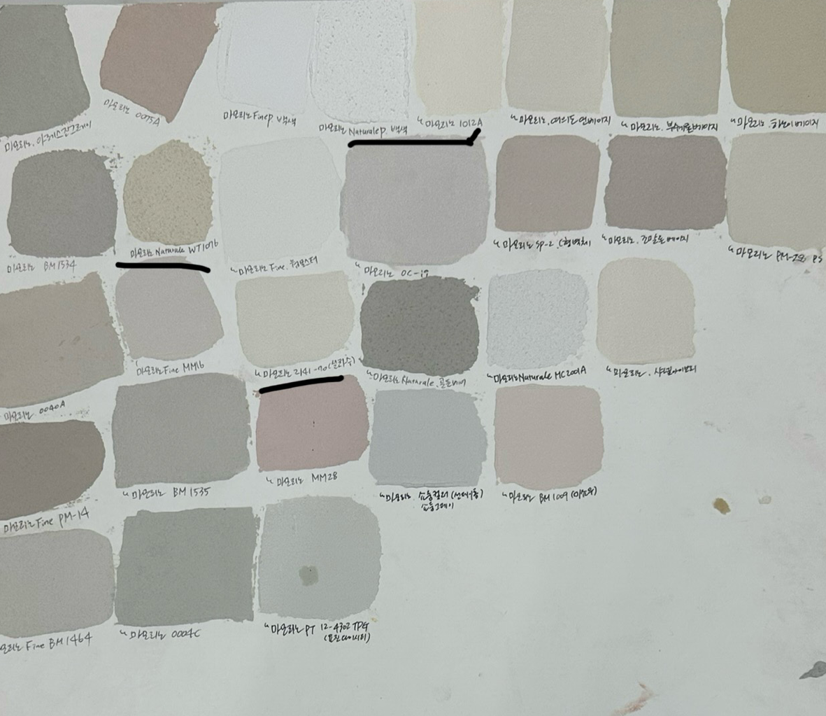 마음에 드는 컬러를 비교하고 또 비교했다. 오이코스 측에 마음에 드는 컬러칩을 전달해 조색을 맡겼고, 오이코스에서는 눈으로 보았을 때 최대한 비슷한 컬러가 나오도록 컬러칩 옆에 색을 올려가며 조색을 해주셨다고 했다.