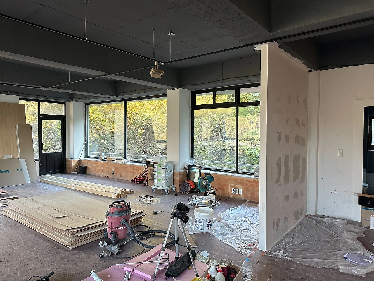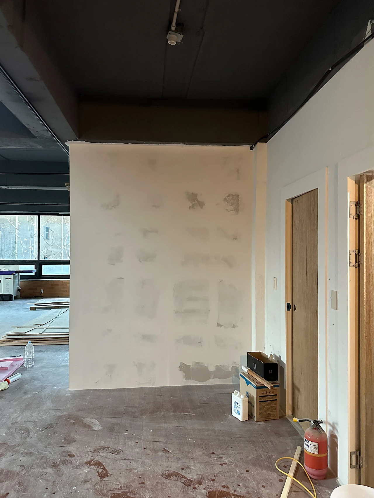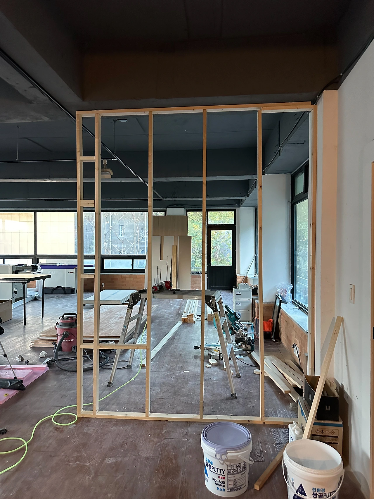 추가로 쇼룸 내부에 가벽을 설치했다. 설치한 이유는 튀어나온 하단의 주황색 벽돌을 가려 매끈한 벽면을 만들기 위함이었다. 쇼룸 벽면은 페인트가 아니라 미장할 예정이라, 퍼티 작업을 가볍게 했다. 특히 신경 쓴 부분은 벽의 모서리이다. 퍼티 때문에 모서리가 뭉개지지 않아야 하므로, 양을 조절하며 직각에 가깝게 작업했다.