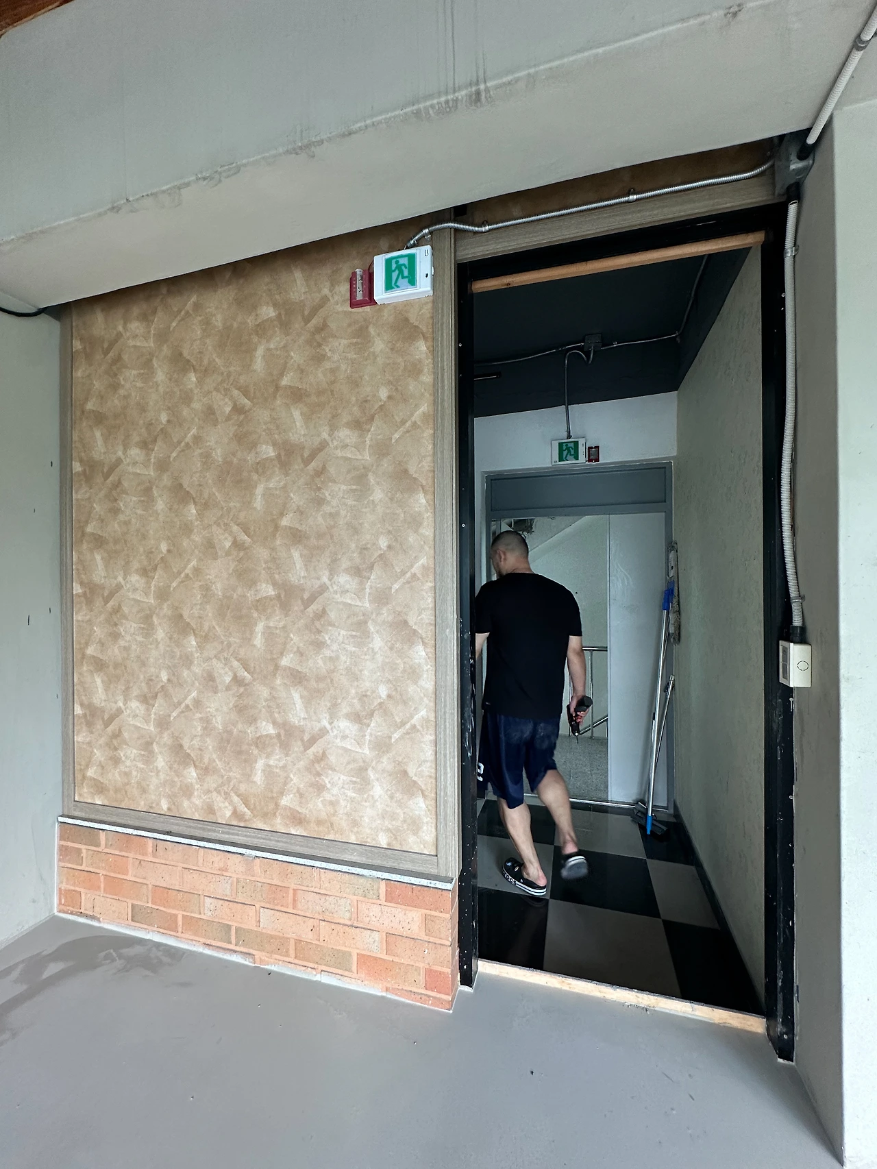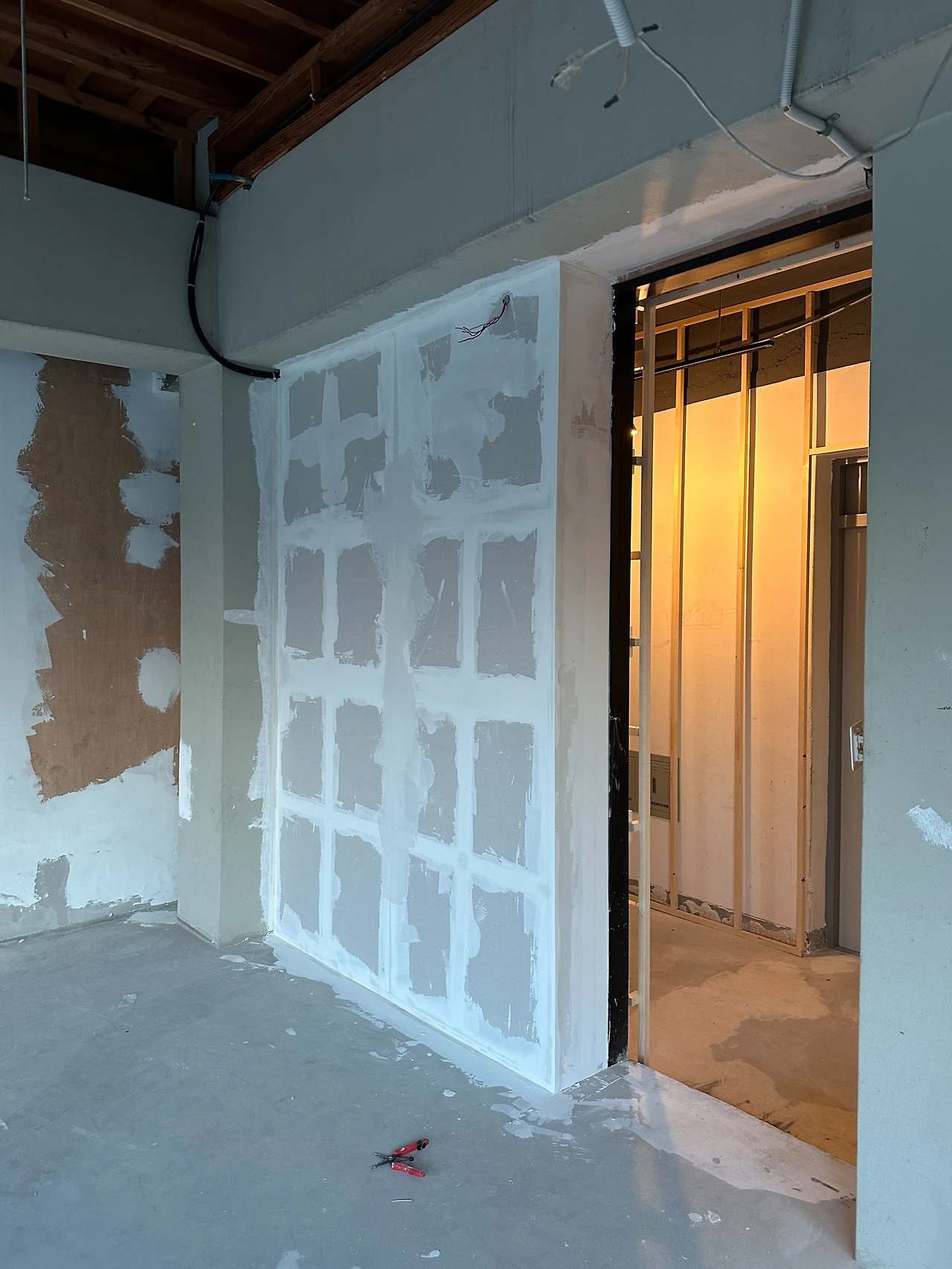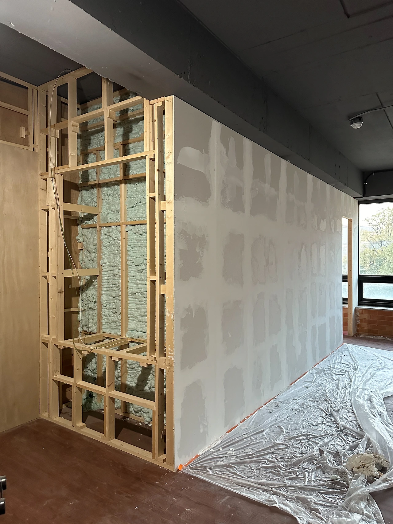 추가로 쇼룸 내부에 가벽을 설치했다. 설치한 이유는 튀어나온 하단의 주황색 벽돌을 가려 매끈한 벽면을 만들기 위함이었다. 쇼룸 벽면은 페인트가 아니라 미장할 예정이라, 퍼티 작업을 가볍게 했다. 특히 신경 쓴 부분은 벽의 모서리이다. 퍼티 때문에 모서리가 뭉개지지 않아야 하므로, 양을 조절하며 직각에 가깝게 작업했다.