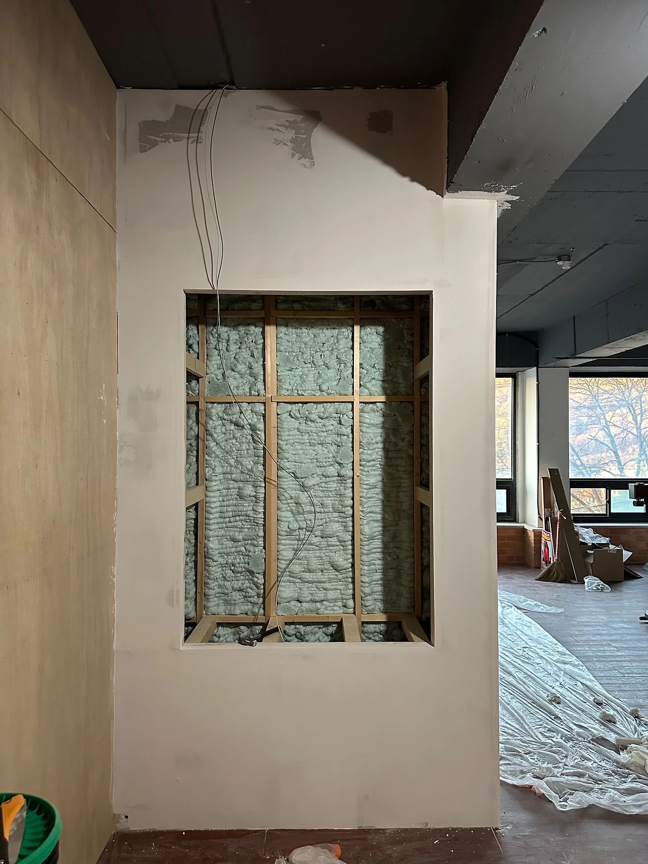 입구에서 정면으로 보이는 가벽이다. 뼈대 뒤로 보이는 공간은 작업실으로 사용될 곳이다. 우리는 입구에서 작업실이 직접적으로 노출되지 않기를 원했다. 가벽 앞에는 벤치를 두어 손님들이 쉴 공간을 만들고, 반대편 가벽 앞에는 목자재를 보관할 수 있는 선반을 만들 생각이다. 현관부터 카운터를 지나, 작업실까지 천천히 눈에 들어오도록 설계한 구조다.