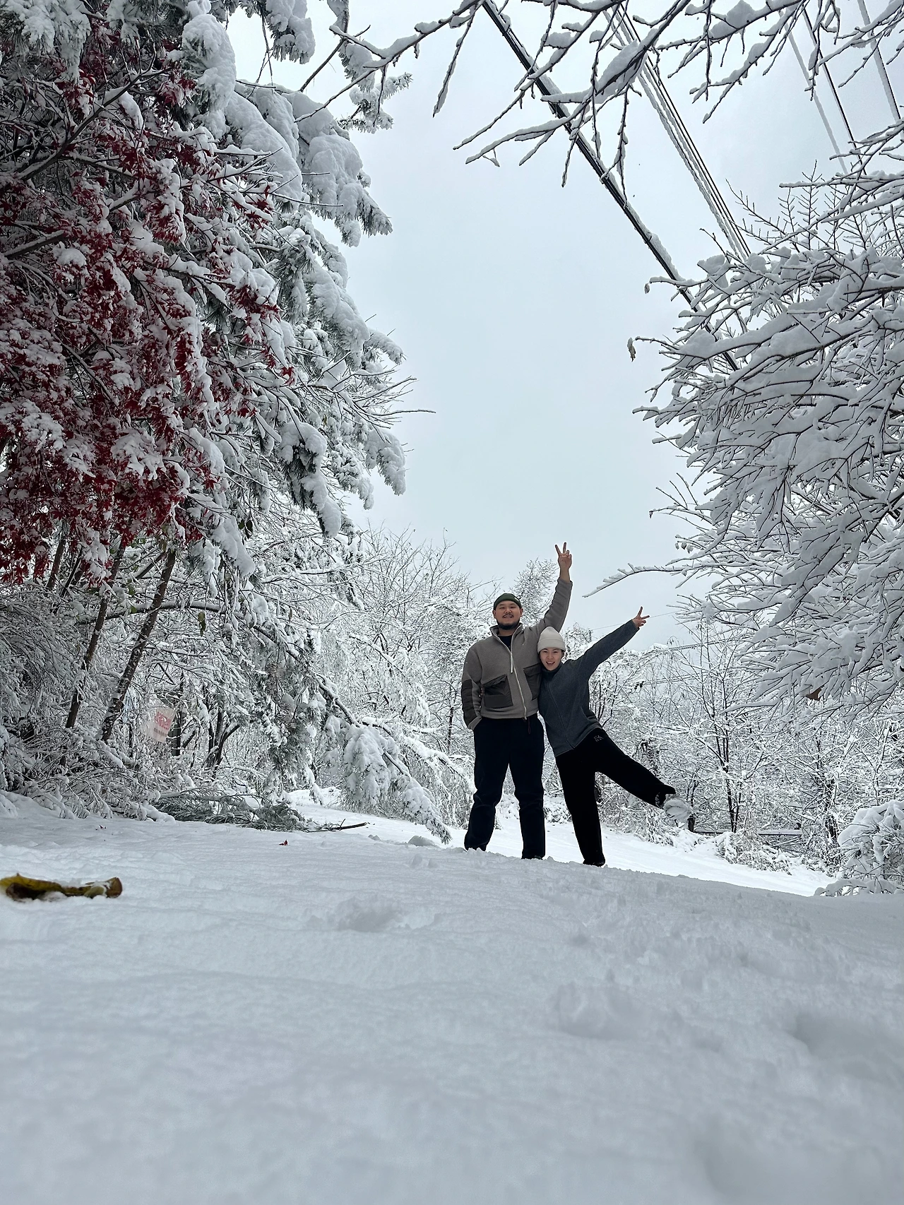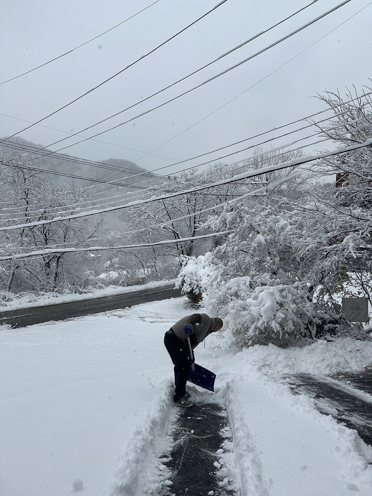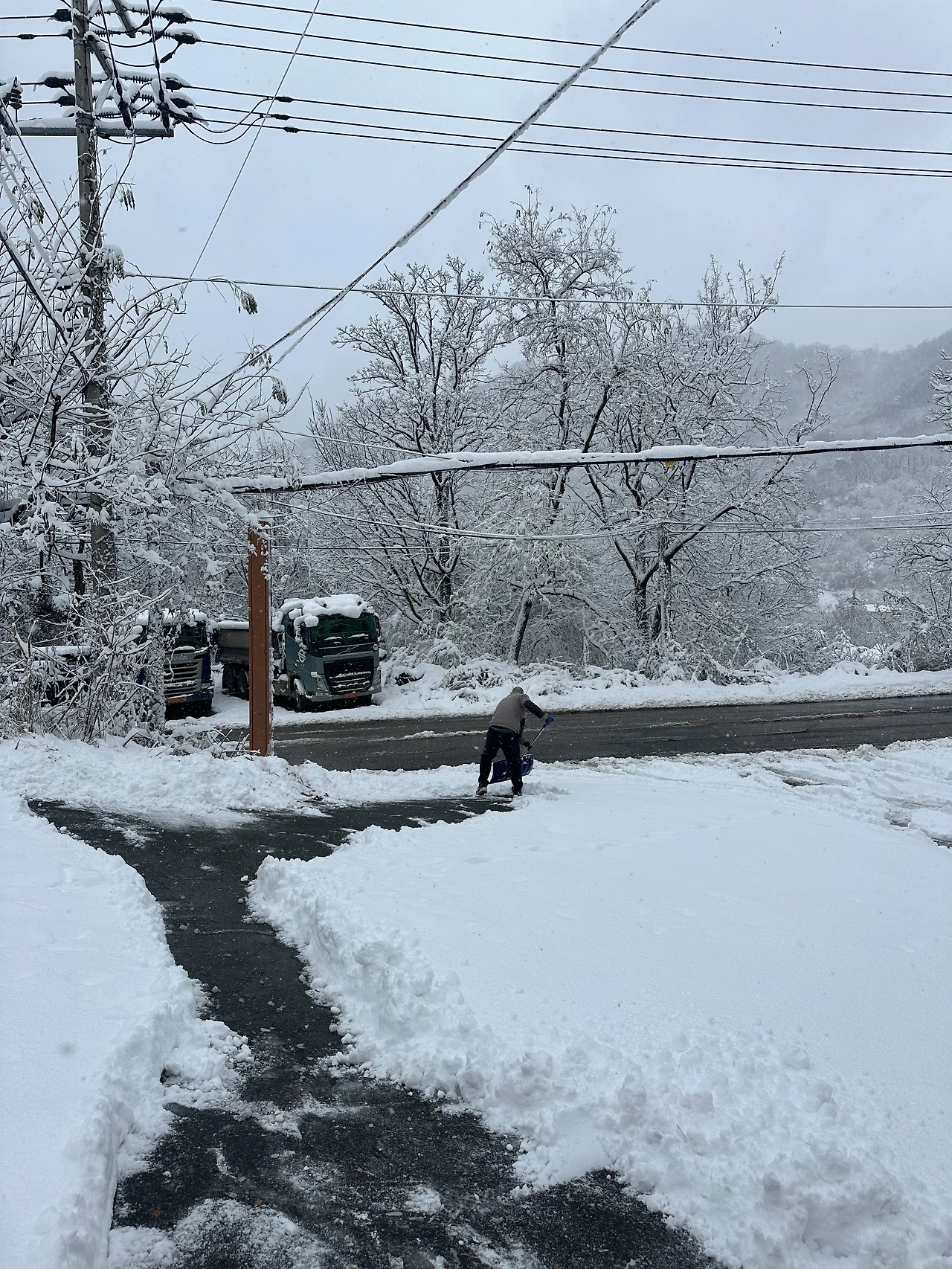 하지만 이곳은 주차장으로 쓰는 언덕길이라 마냥 두고 볼 수만은 없었다. 차들이 오가는 길목이라 제설을 해야 했다. 철물점으로 가서 도구를 사 왔다. 공기는 차갑지 않았지만 눈을 치우다 보니 손이 얼어갔다. 한 시간가량 넓은 면적을 둘이서 열심히 쓸어내렸다.