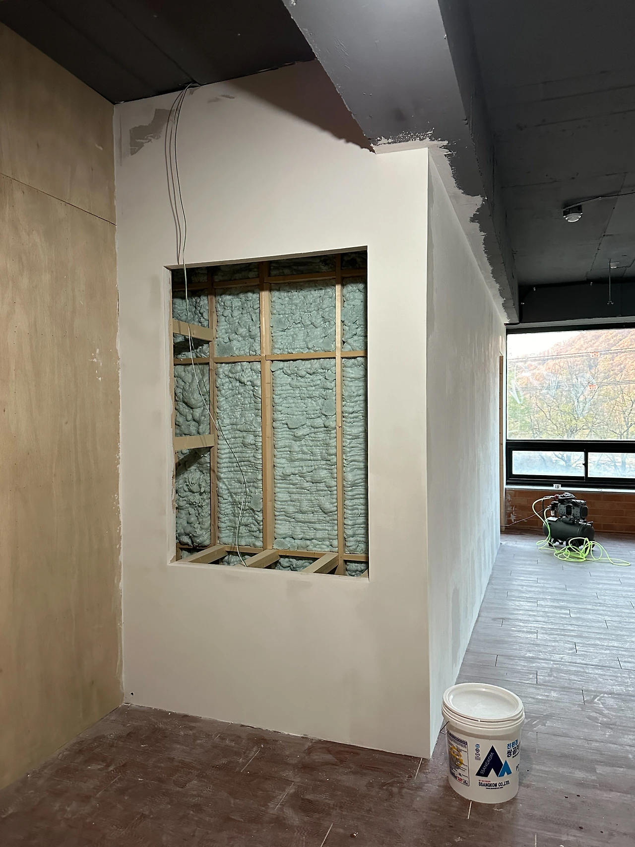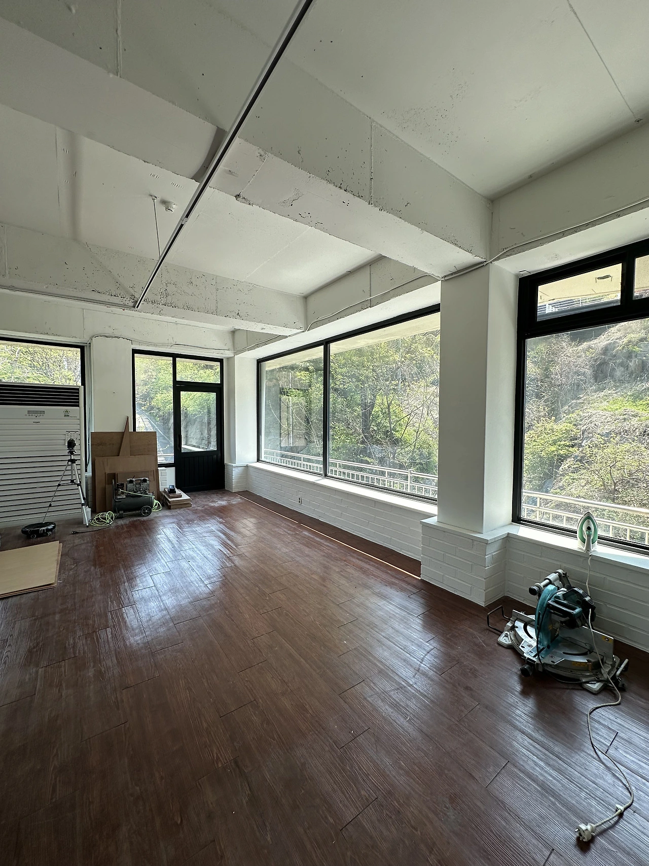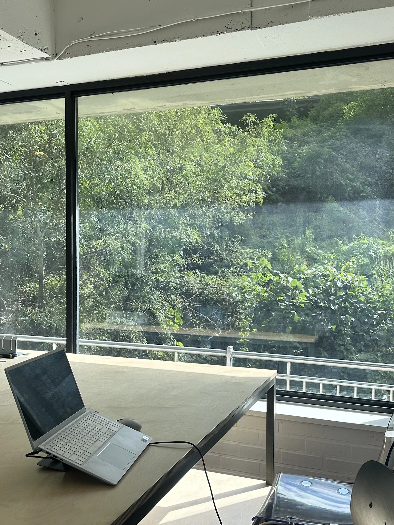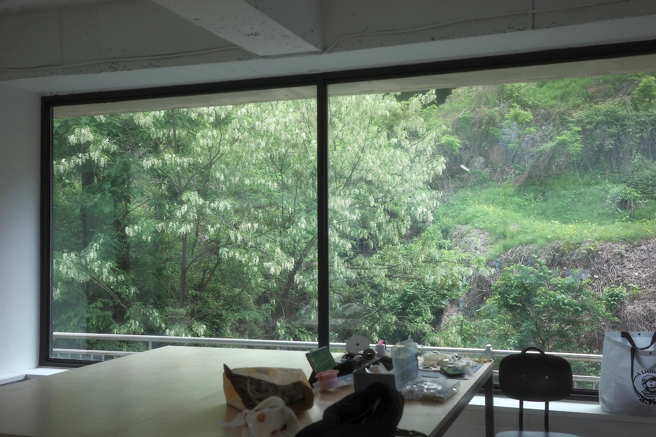 비워둔 자리는 작업실에서 가장 크고 예쁜 창이 보이는 곳이다. 건너편의 푸른 나무, 작은 계곡을 마주하며 작업할 수 있도록 테이블 위치를 잡기로 했다.