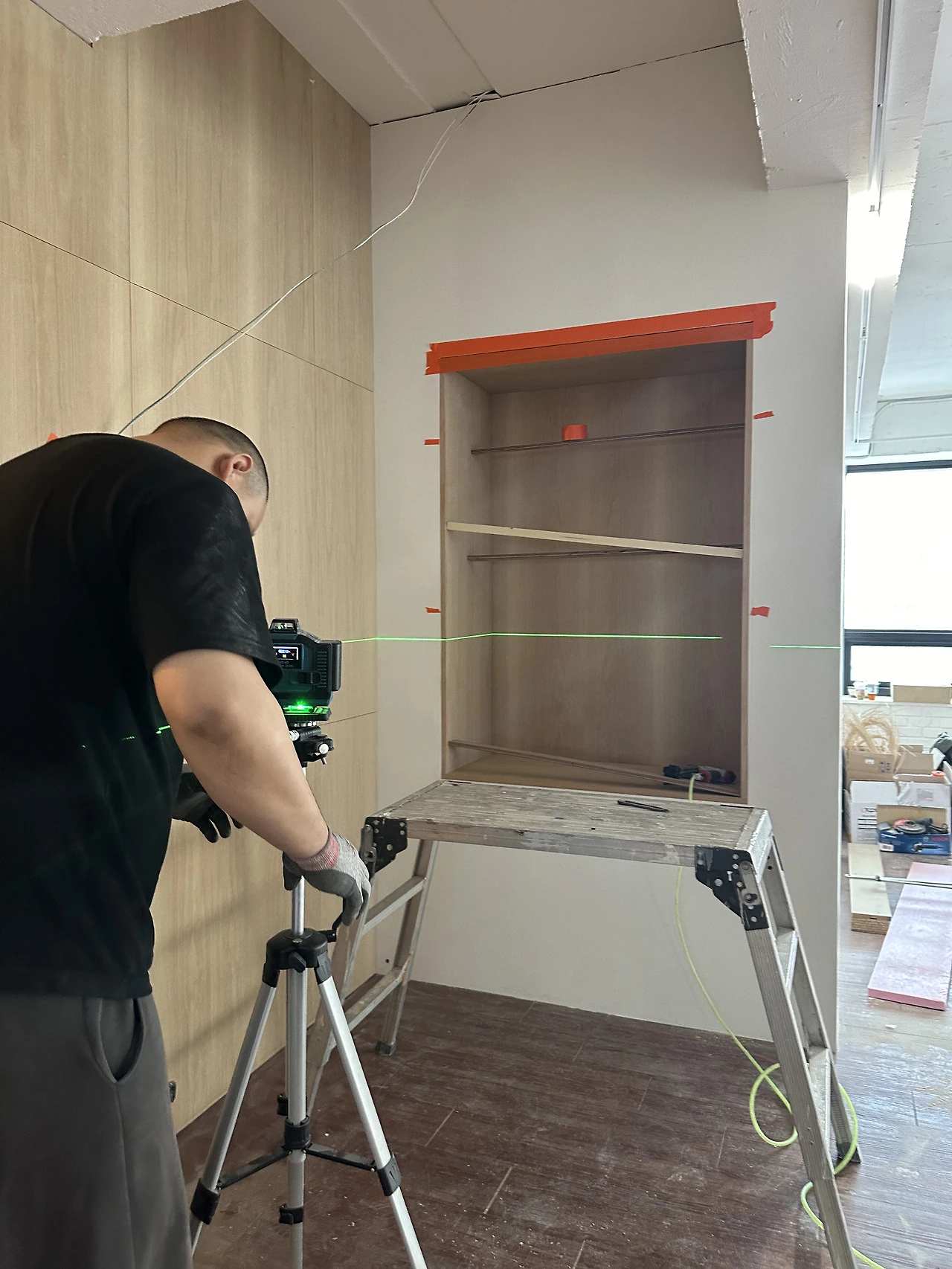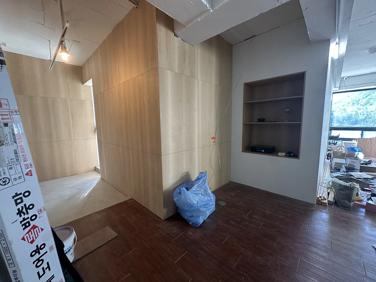 가벽을 만들 때 내장 선반을 넣을 공간을 남겨 두었다. 내장선반이 들어갈 곳은 세로길이만 1 미터가 넘는 규모로 크기가 꽤 크다. 현관을 지나 작업실로 가는 길목에 시선이 머무는 선반이 되길 바랐다.