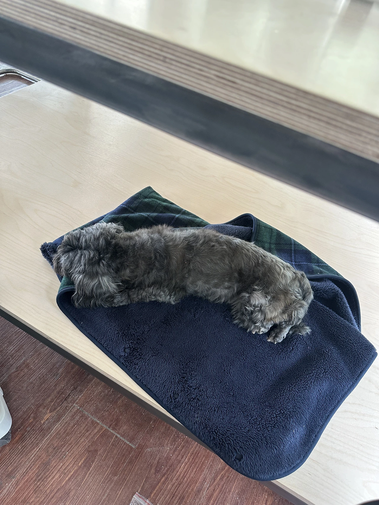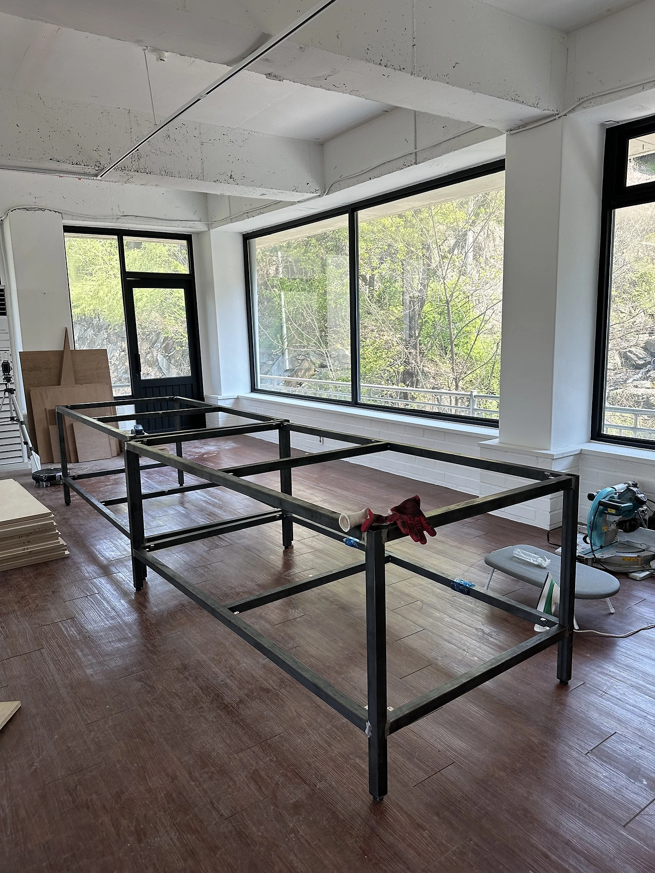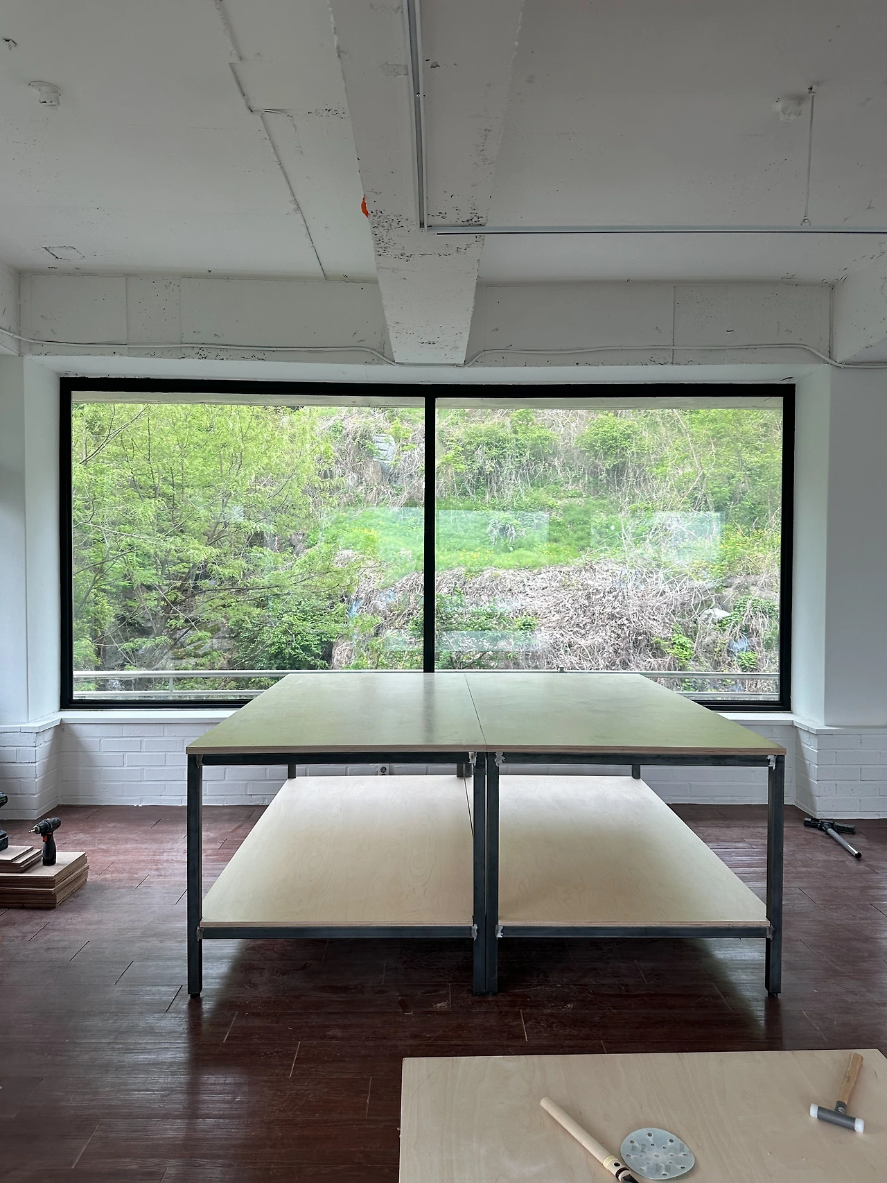 우리는 제작해 온 철제 뼈대 위에 자작나무 판을 잘라 올렸고, 크기는 2000 ×1000mm 판 두 장을 이어 붙였다. 크기가 큰 만큼 오빠와 함께 합을 맞추는 것이 중요했다. 작업실 바닥은 어둡고도 붉은 갈색이라 밝은 자작나무와 철제가 놓이면, 보다 조화로울 것이라 생각했다. 판이 자리에 올라가자 예상했던 모습이었다.