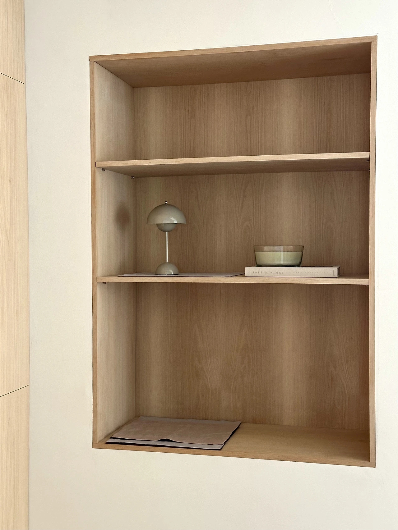 무늬의 결이 고운 화이트 오크 내장 선반이다. 받침 피스를 추가로 박으면 여러 높이로 조절해 사용할 수 있다. 이곳에 높은 화병이나 스피커, 책 등을 올려 볼 생각이다.
