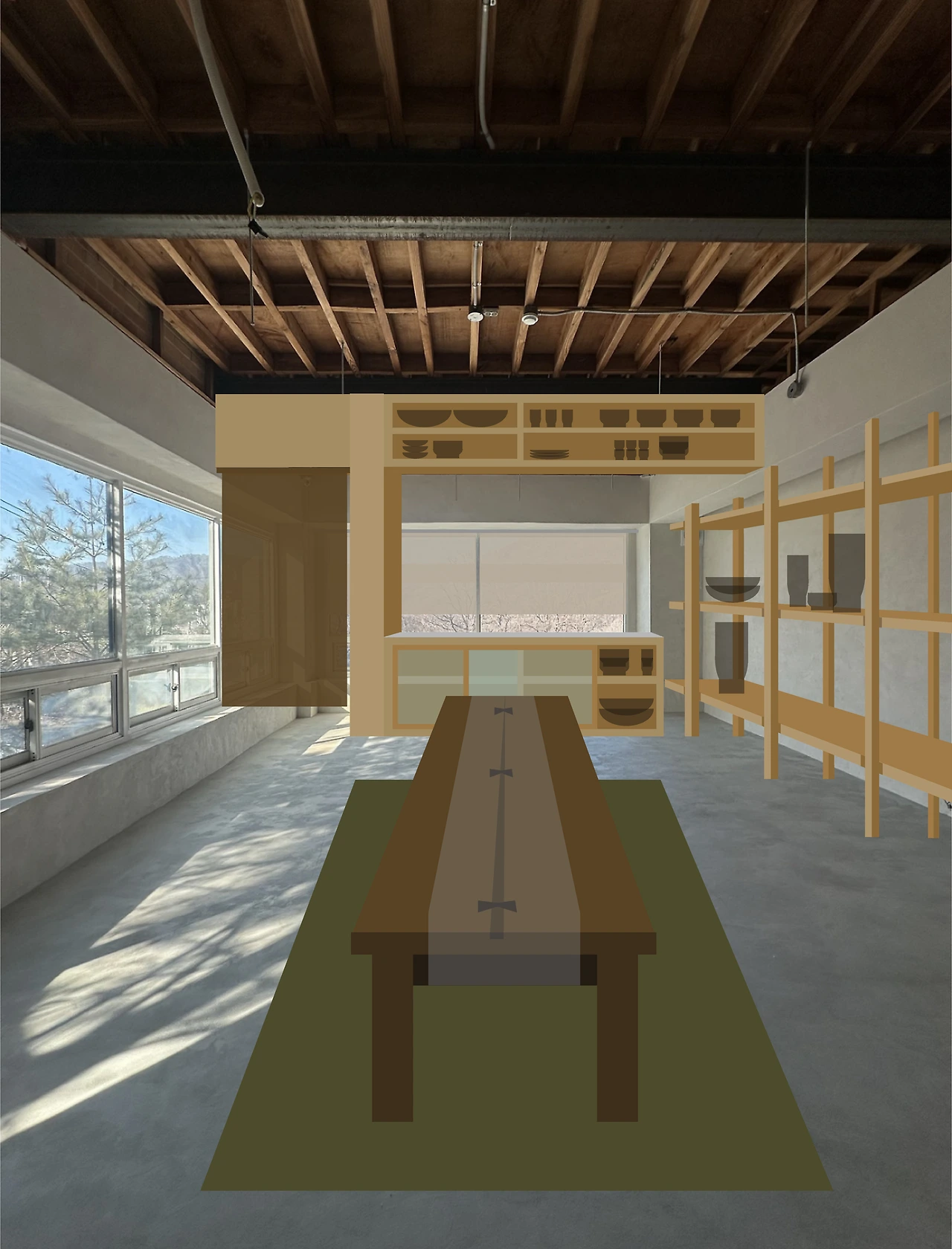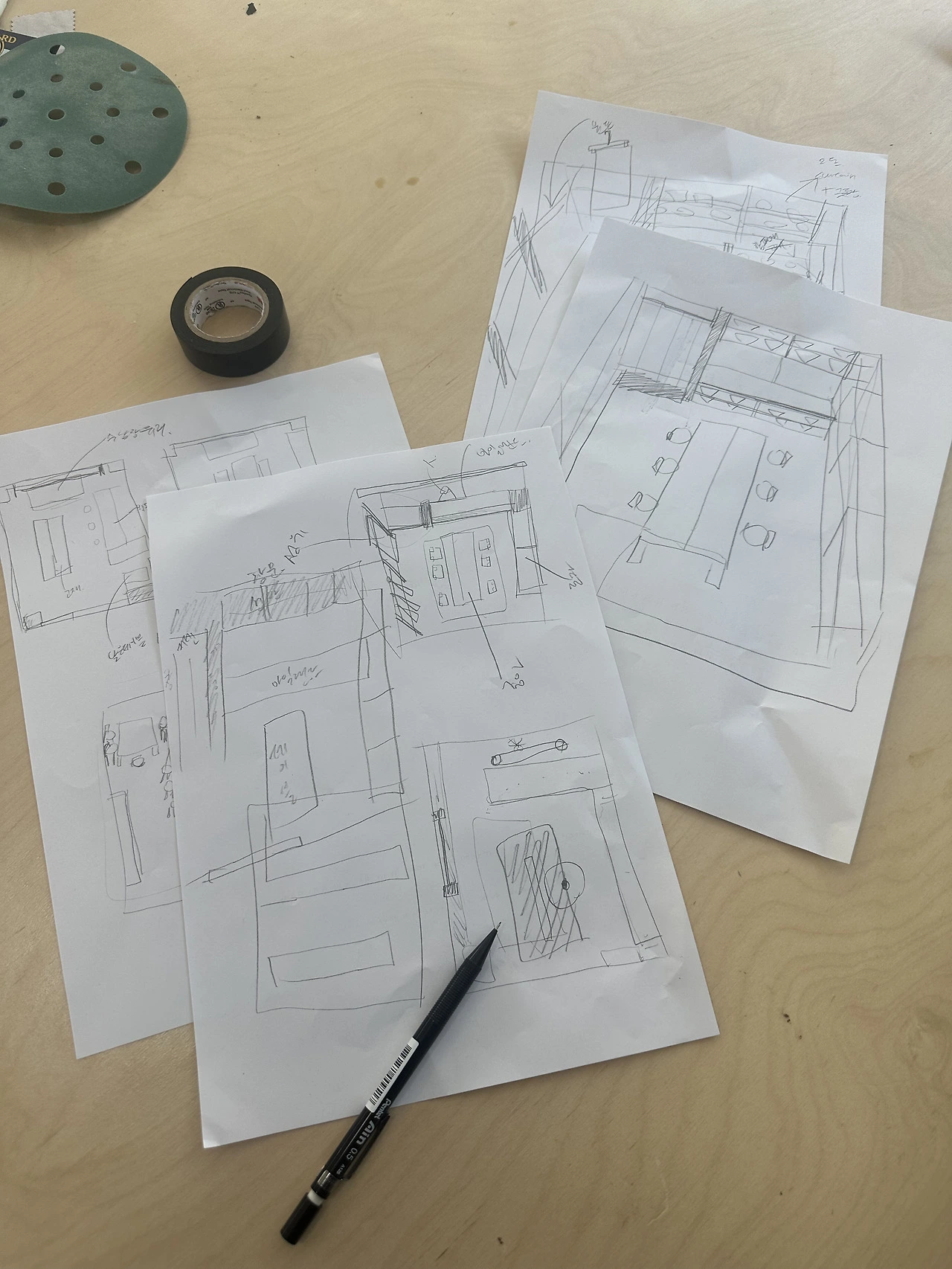 나는 상업공간과 주거공간의 중간쯤의 놓인 느낌을 원했다. 쇼룸이지만 누군가의 집에 초대받은 듯한 따뜻한 공간이 되기를 바랐다. 주거하는 입장에서 손님을 맞이하는 장면을 떠올리며, 한참을 바닥에 이리저리 앉아 스케치를 했다. 결국 주방과 테이블이 마주 보도록 하는 구조를 그려냈고, 이 구조가 가장 마음에 들었다.