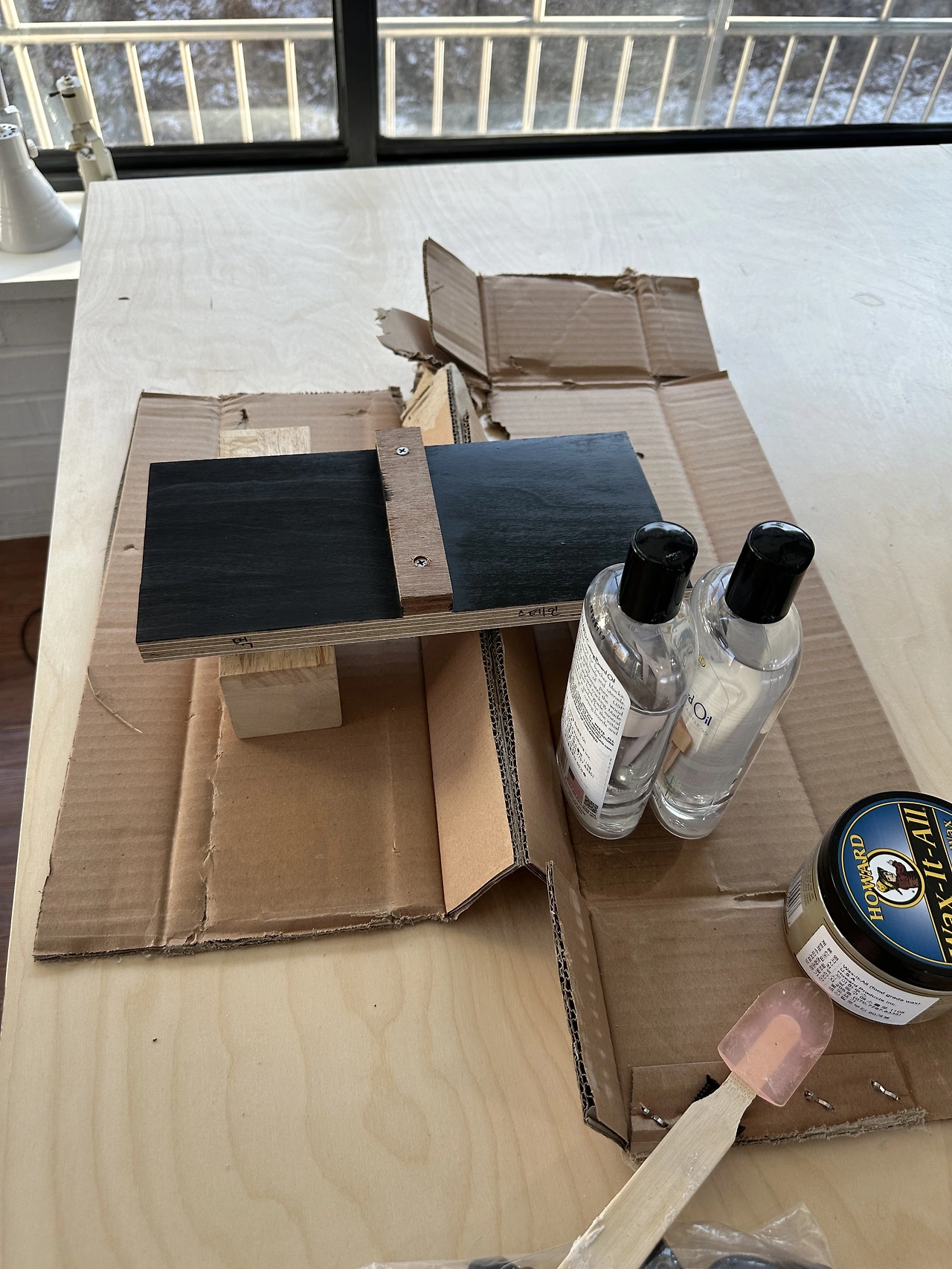 오빠는 먹과 스테인을 구매하여 자작나무 합판에 한 칸씩 테스트를 했다. 서랍장은 먹으로 1회 칠하고, 스테인 1회 칠하여 마감하기로 했다. 이후 바니쉬를 칠해 상태를 보며 마감할 예정이다.
