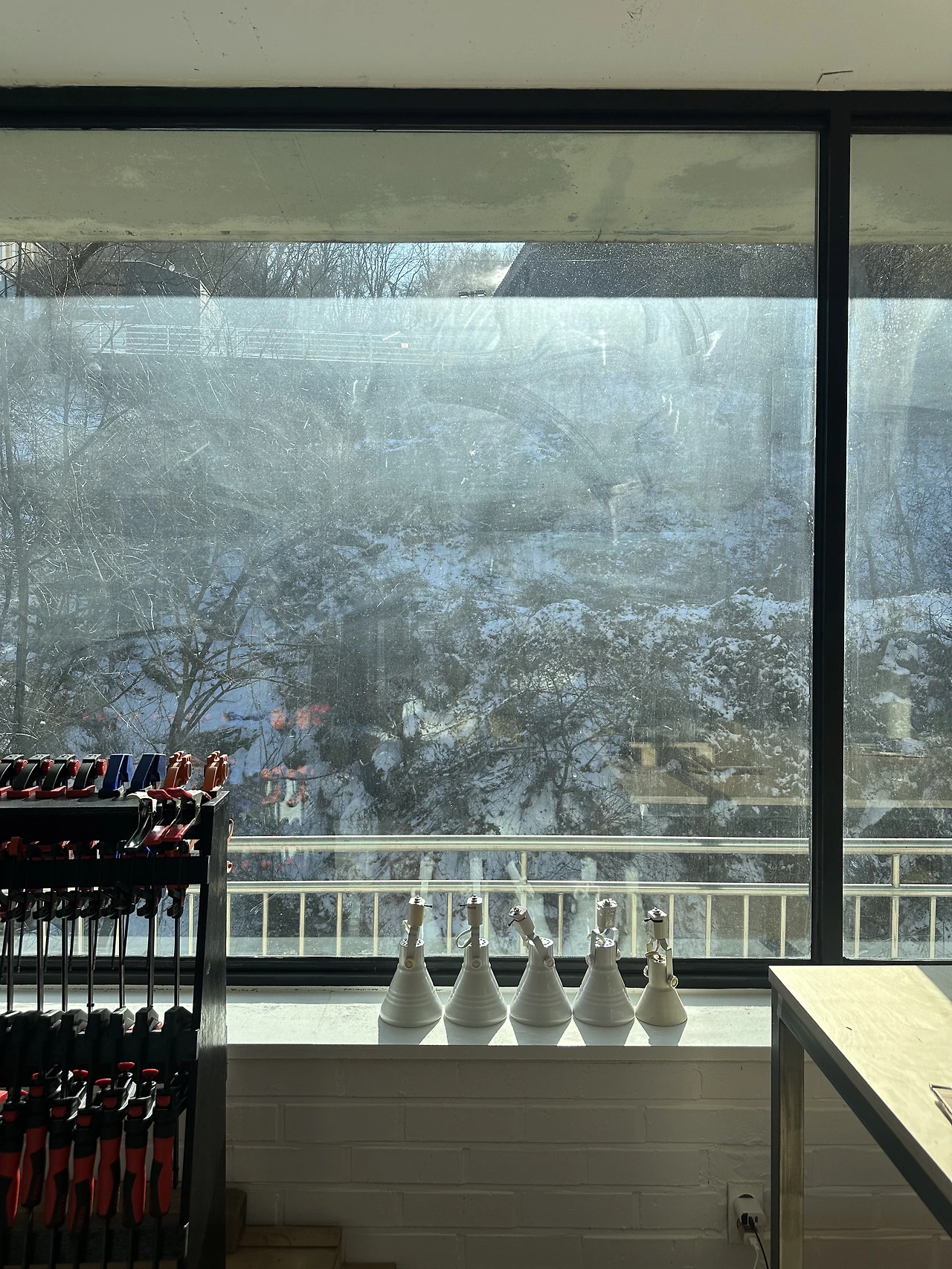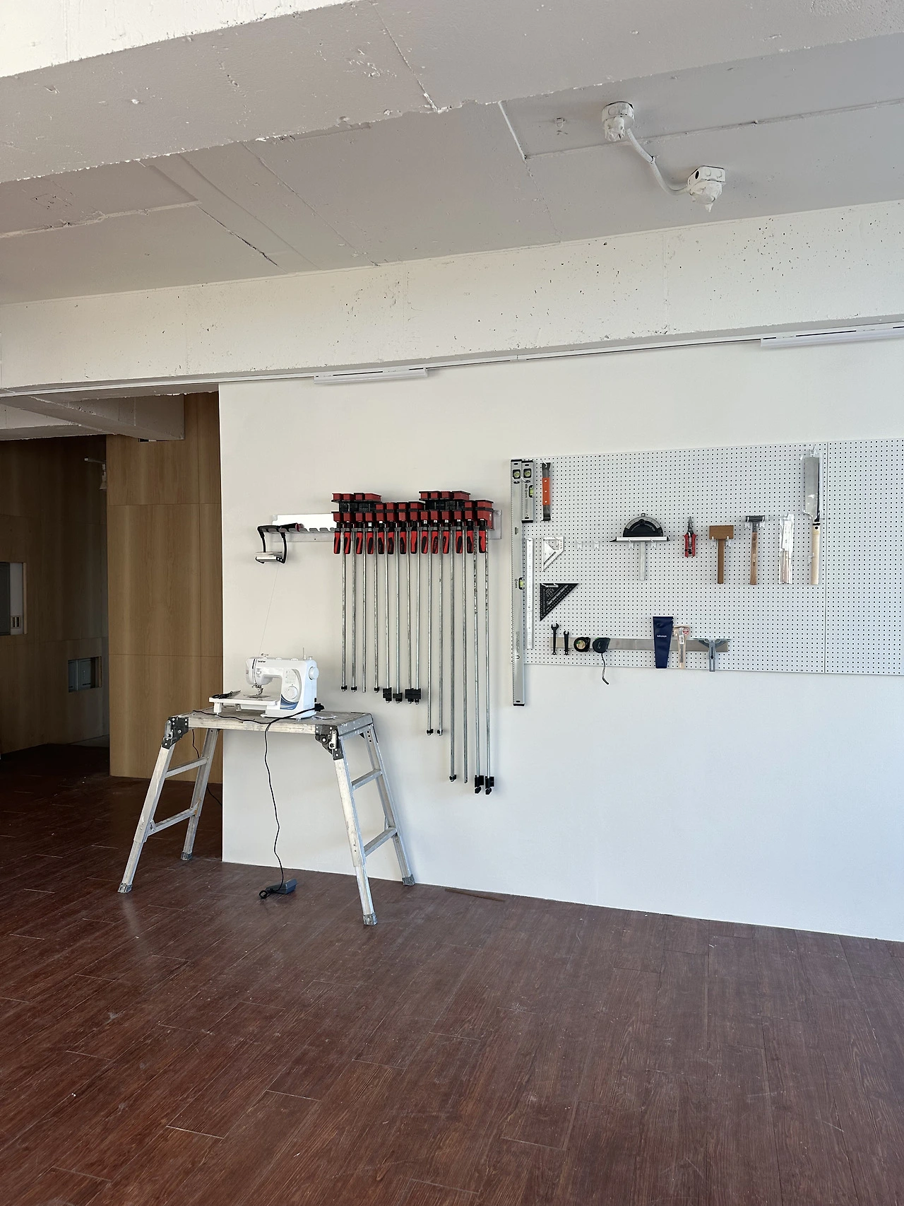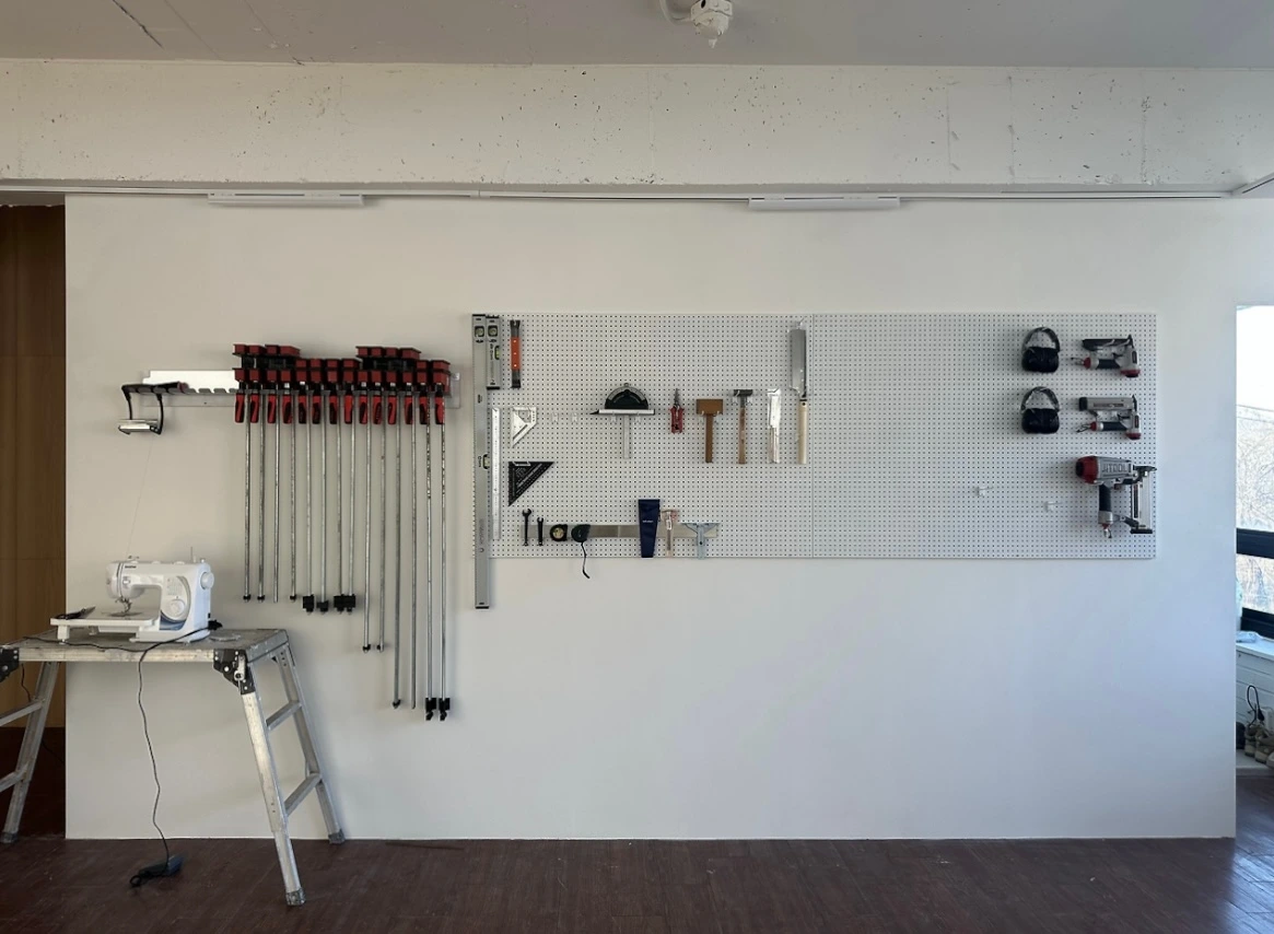 한동안 정리가 안되던 클램프와 도구들을 걸 자리를 찾았다. 바로 가벽이었다. 언젠가 작업실을 차리게 되면 벽 한편을 사용하여 멋지게 수납을 하리라 마음을 먹었는데 드디어 때가 온 것 같았다.