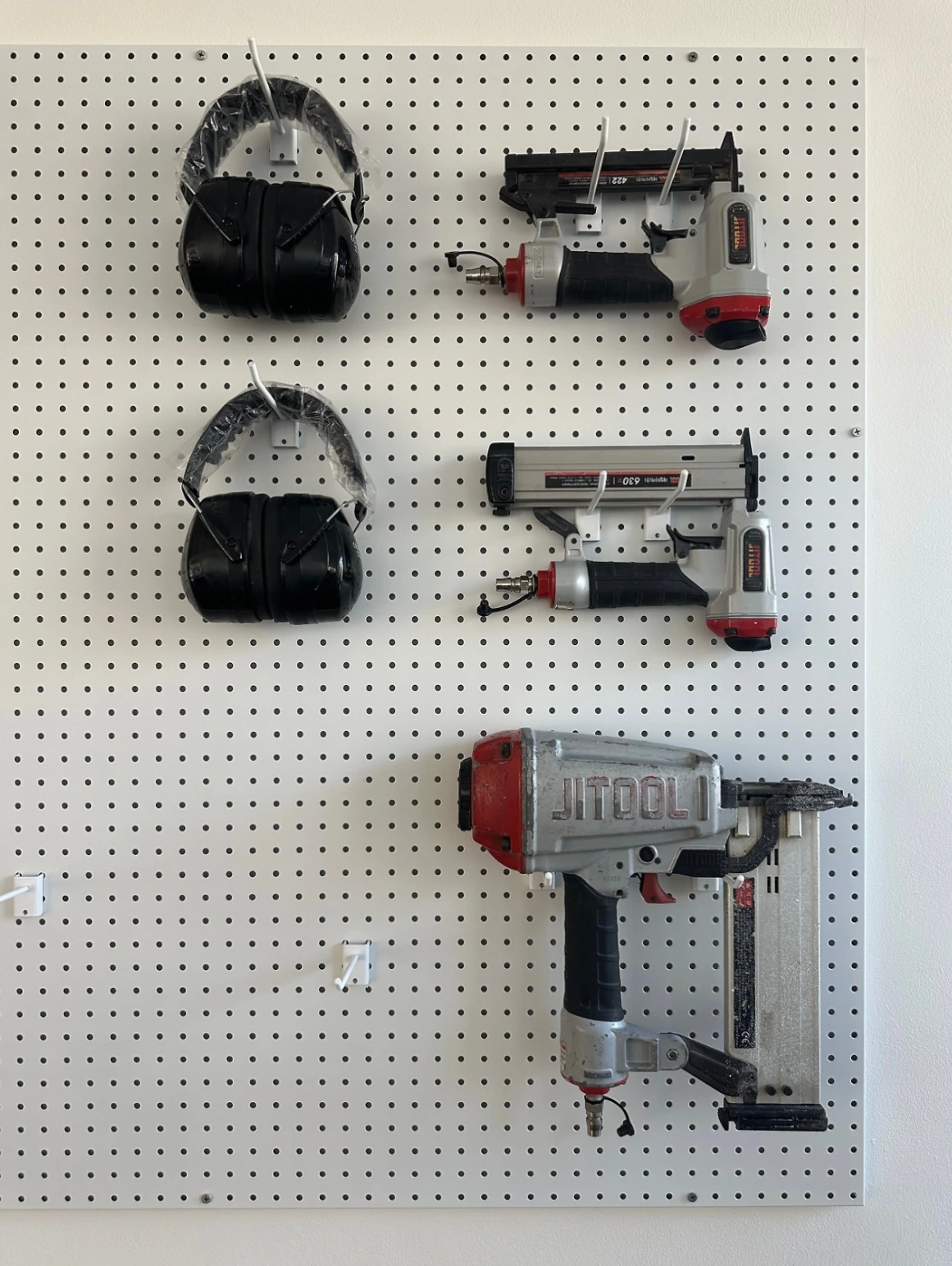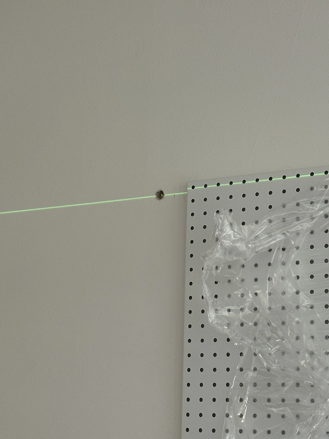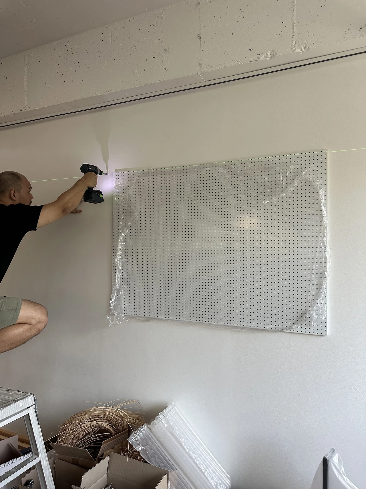 도구는 차츰 사들이기로 하고, 하나씩 예쁘게 걸어보자는 마음으로 타공판을 주문했다. 벽이 하얀 편이라 툴이 걸리면서 오브제처럼 보였으면 했다. 타공판도 하얀색으로 주문 제작을 했고, 오빠는 타공판이 도착하자 서둘러 레이저기로 라인을 땄다.
