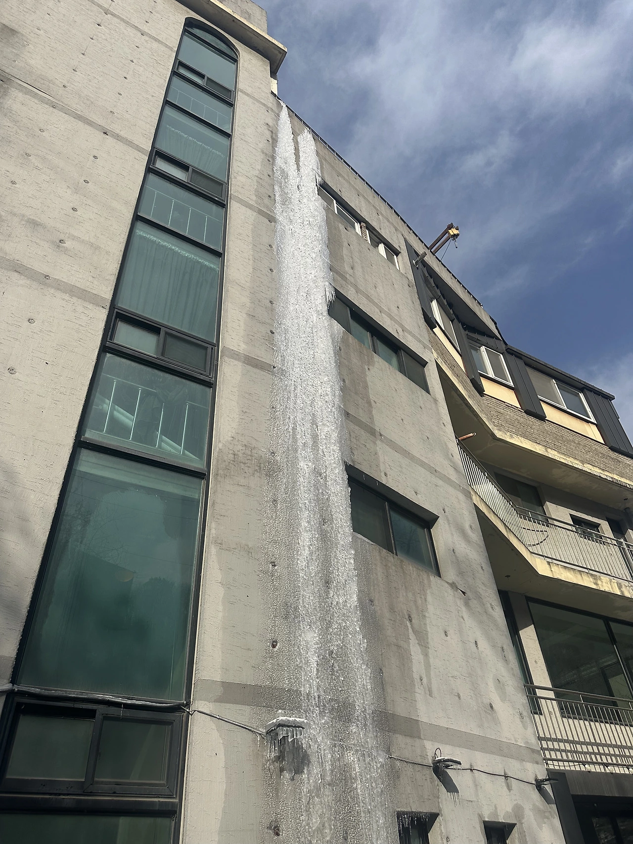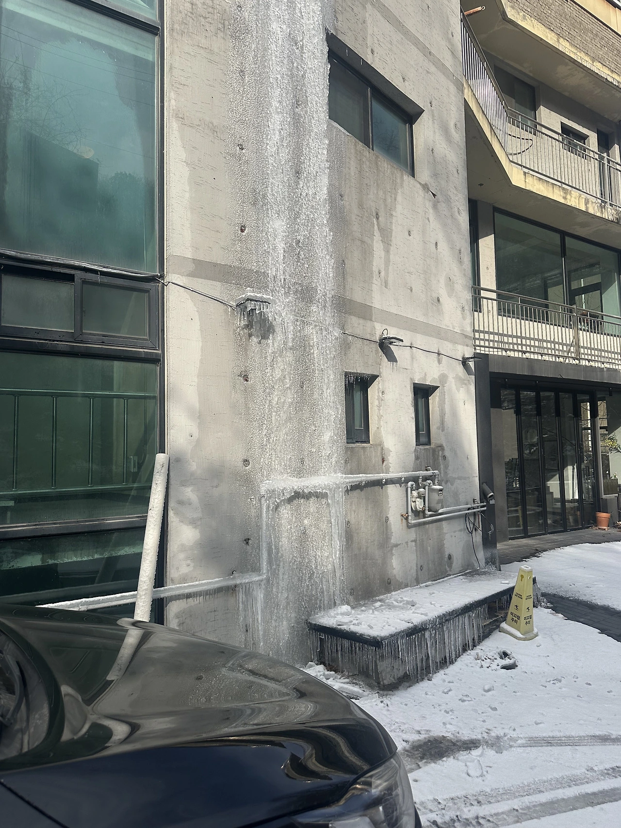 이 정도 큰 고드름은 처음 봤다. 5층 가량의 벽면을 뒤덮어 내려온 고드름 줄기는 바닥까지 이어지고서야 끝이 보였다. 주말에 일을 끝내고 오니 보인 건물의 모습은 처참했다.