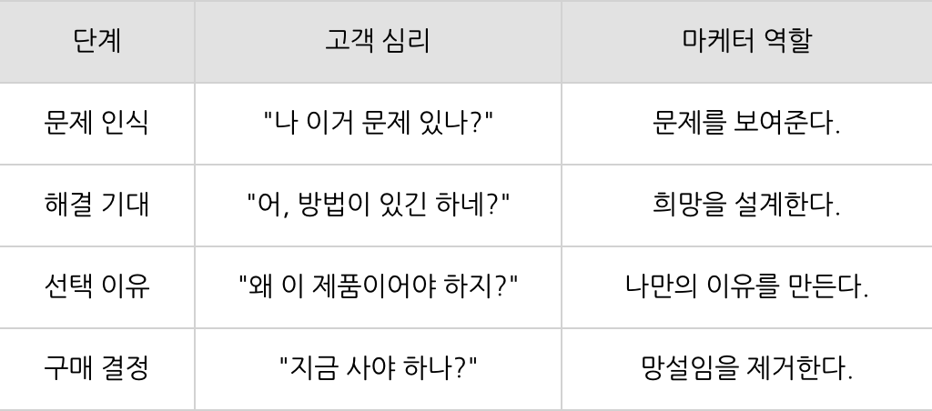 * 문제 인식 → 해결 기대 → 선택 이유 → 구매 결정