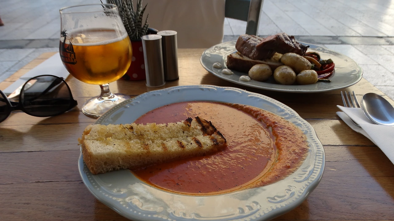 숙소에서 얼마 멀지 않은 곳에 사람들이 꽤 앉아있던 식당에 자리 잡고 참치 스테이크와 토마토 수프, 그리고 맥주를 한 잔 주문했다.