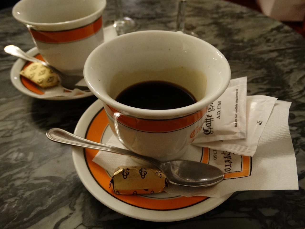 커피에 관심이 많은 나와 친구는 각각 다른 선택을 했다. 친구는 전통적인 에스프레소를, 나는 다소 생소한 카페 코레토(Caffe Corretto)를 마셔 보기로 했다. 뭐 사실 그리 큰 기대를 한 것은 아니었다. 관광지로도 유명한만큼 그저 그 정도(?)의 커피이려니 생각했다. 나이가 지긋한 웨이터에 따르면 카페 코레토는 에스프레소에 럼주나, 코냑 혹은 이탈리아의 전통 식후주인 그라파(Grappa)를 첨가해 주는 것이라고 한다. 어떤 술이 가장 도수가 높냐고 물으니 그라파라고 하길래 흔쾌히 그걸로 달라고 했다. 뭐 음주운전을 할 일은 없을 테니까.