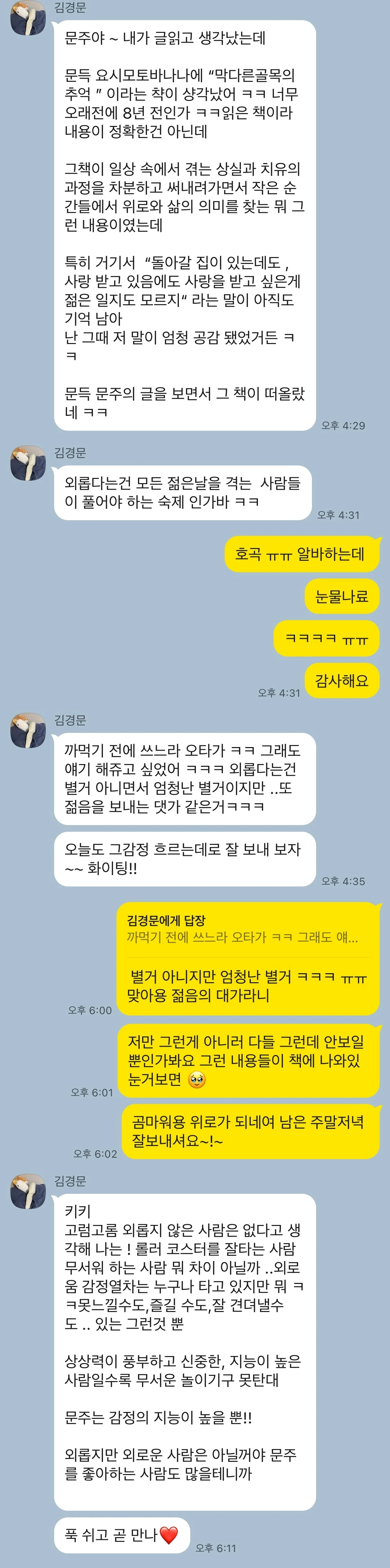 지쳤다는 이야기가 더 맞는 것 같습니다. 방긋 웃으면서 일해야 하는 아르바이트도, 쌓여있는 집안일도, 썰렁해진 집안 공기도 한몫을 하는 것 같고요. 잘하고 있다는 지지를 받고 싶습니다. 내가 정말 좋아하는 내 사람들에게 응원받고 싶습니다. 같이 일했던 동료들이 생각나요. 유진님 애지님 경문님 누리님... 점심시간에 노닥거리고 근근이 저녁에 술 한잔 하면서 얘기했던 동료들. 몇 주 전 소개팅 나가기 전에 경문님은 그런 말을 해줬었던 게 기억나요. "문주를 못 알아보면 그건 걔가 안목이 없는 거야." 그런 막연한 지지들. 다시 생각해 보니 너무나 감동이네요. 제 부족한 모습들을 보셨으면서도 그냥 마냥 저를 편애해 주는 그런 이야기들이 그때의 제 버팀목이었습니다.