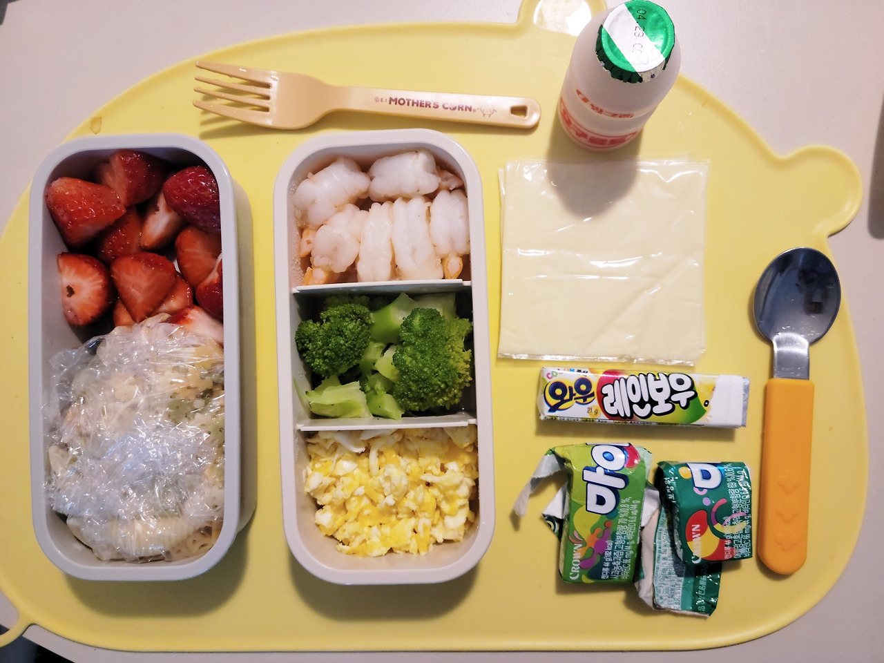 두번째는, 아이용 도시락. 회식 장소에 가서 아이 것을 따로 시키기도 번거롭고 뭐가 있는 지 알 수도 없어서 과일과 브로콜리, 새우 등등등을 넣어 싸고 또 최후의 수단으로 마이쮸나 새콤달콤같은 평소에 잘 주지 않는 주전부리도 넣는다. 집에 가자고 할 때마다 하나 언제 가냐고 속삭이면 또 하나. 아마 치트키를 하나씩 쓰다보면 돌어올 시간이 되겠지.