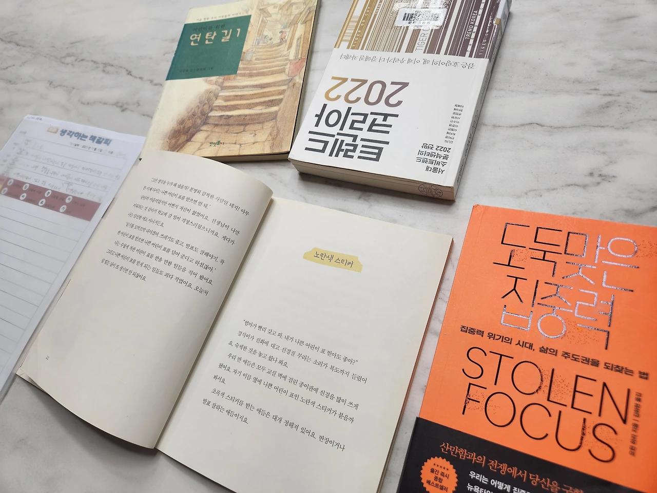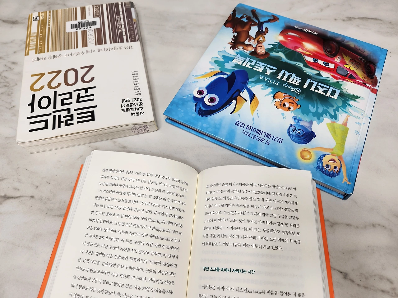 남편의 대답은 기특했다. 평생 전공서적 외에는 책을 멀리하며 살아온 공대 출신 남자지만 요즘 독서에 재미를 붙이려고 노력 중이라고 했다. 내가 두 권, 세 권 읽을 때 남편은 이제 2 챕터쯤 읽은 건지 매일 같은 책을 열흘째 들고 있지만 그래도 지난 10년 세월에 비하면 장족의 발전이라 느껴져 고마운 마음이 든다.