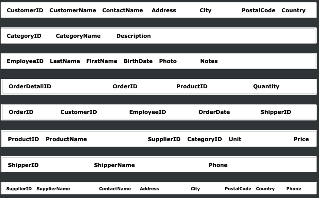 OrderDetails의 경우, OrderID와 ProductID를 참조하기 때문에 Orders와 Product의 테이블과 관계를 맺지만, 다시 Product는 SupplierID와 CategoryID를 참조함을 알 수 있습니다. 따라서 1 depth를 더 들어가서 Suppliers와 Categories 테이블로부터 값을 불러냅니다. 총 3단계 형태의 스키마가 완성됩니다.