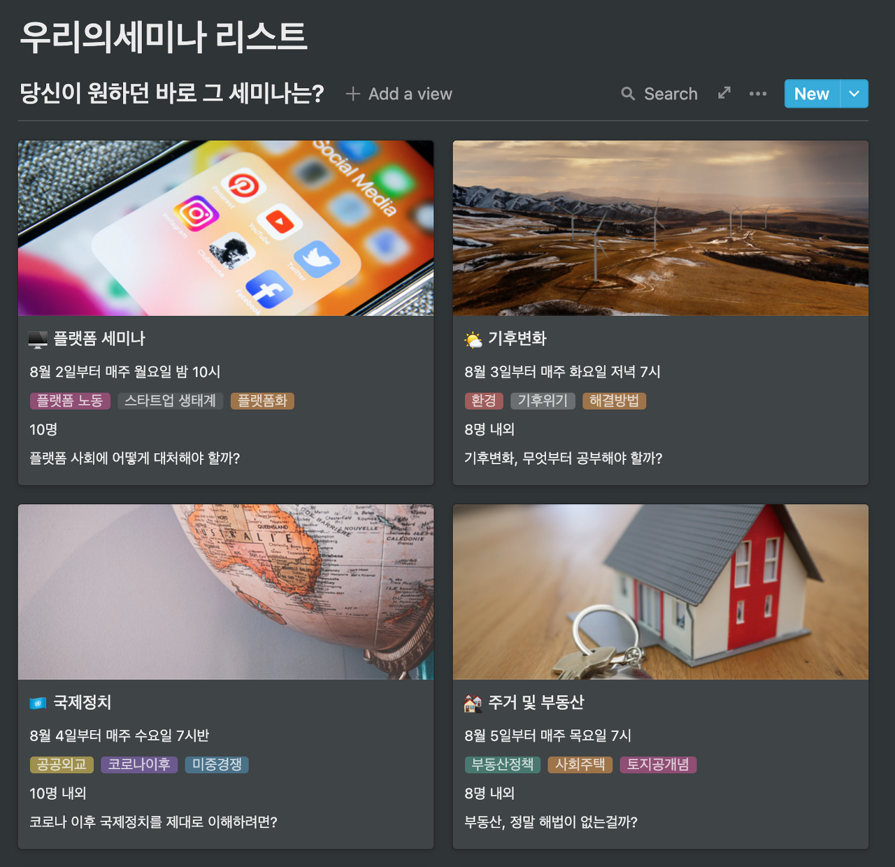 위와 같이 '우리의세미나'라는 이름으로 세미나 모집 페이지를 구축합니다. 소개 페이지를 구축하면서 이 플랫폼을 통해 전달하고자 하는 메시지를 전달하면서 동시에 진짜 있을법한 세미나의 커리큘럼을 만들어서 참여연구자를 모집하는 것이죠.