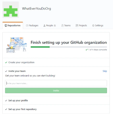 조직을 같이 운영하고 커밋할 동료들을 초대할 수 있다. Search by username 에 동료들의 깃헙 계정을 입력하고 Invite를 누르자. 친구들이 없다면......Skip this step. Organization을 만든 후에도 초대할 수 있으니 걱정하지 말자..