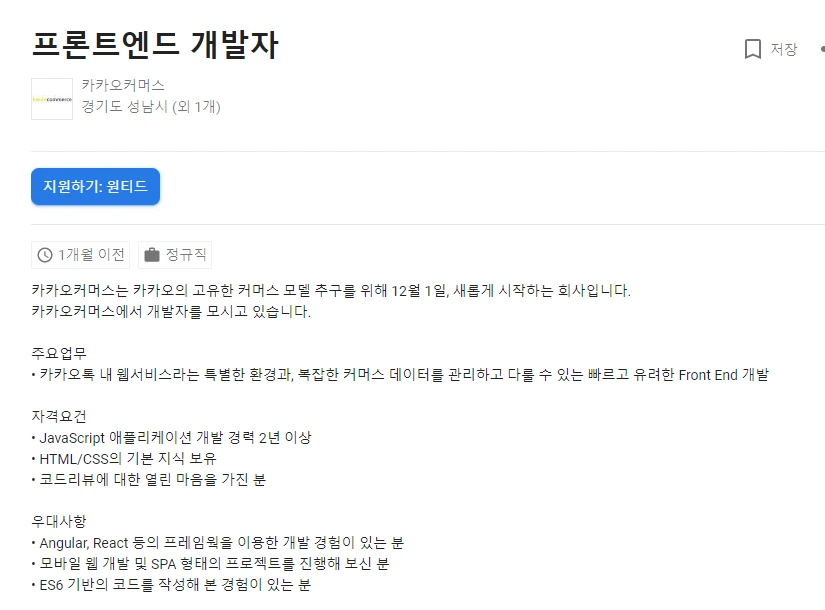 단순히 정보 취득에서 끝나면 안 된다. 자격요건과 우대사항을 보며 '자가 피드백'을 해야 한다. 예시를 보며 직접 해보자. 아래 채용공고는 카카오커머스의 프런트엔드 개발자 구인공고이다. 본인이 프런트엔드 개발에 관심이 있고 구직을 하고 있다고 가정 해보자.