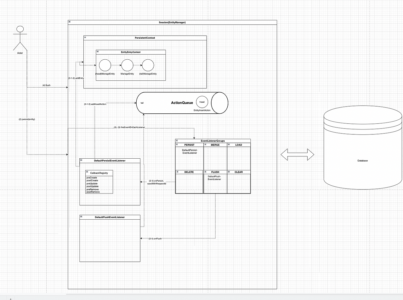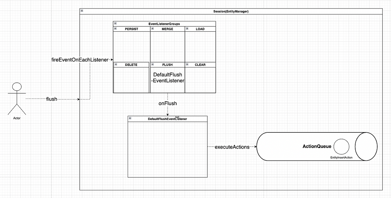 모든 영속화 작업이 끝났다면 Session의 flush가 호출된다(코드). FlushEvent를 Flush Event Group에 넘겨 DefaultFlushEventListener의 onFlush를 호출한다(코드 1, 코드 2). DefaultFlushEventListener는 ActionQueue의 executeActions를 실행하여 ActionQueue에 담긴 Action들을 일괄 실행한다(코드). Action의 execute 함수가 실행되며 Action의 종류에 따라 INSERT/UPDATE/DELETE 구문이 생성돼 실행된다(코드).