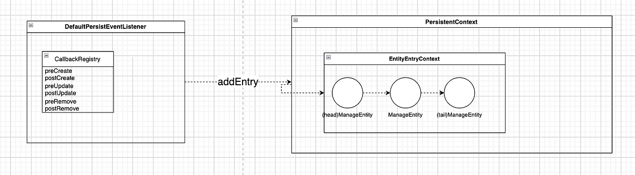 영속화된 엔티티는 EntityEntryContext에서 리스트 자료구조로 관리된다(코드). 가장 최근에 영속화된 Entity가 tail에 가장 먼저 영속화된 엔티티는 head에 위치한다(코드).
