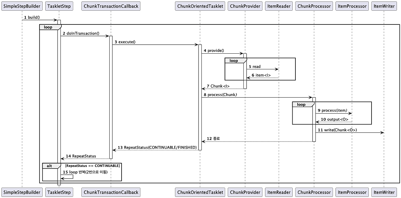 이 클래스는 ItemReader, ItemProcessor, ItemWriter를 chunk 크기만큼 읽고 처리하고 쓴다. TaskletStep은 ChunkTransactionCallback으로 Tasklet을 호출함으로써 chunk 단위로 트랜잭셔널하게 처리되도록 했다.